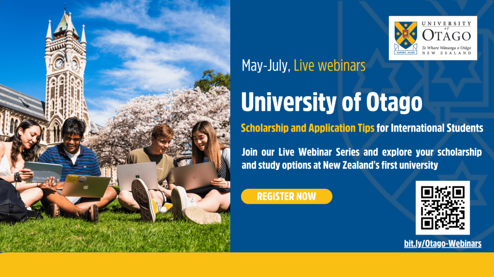 Để lắng nghe những chia sẻ về học bổng và cách ứng tuyển, cũng như tìm hiểu thêm về những lựa chọn học tập hàng đầu tại Otago, người học có thể đăng ký tham gia chuỗi webinar toàn cầu từ tháng 05 đến tháng 07 để trực tiếp trao đổi cùng đại diện Đại học Otago và các sinh viên, cựu sinh viên của trường.