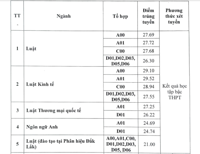 Điểm chuẩn học bạ với các thí sinh đủ điều kiện xét học bạ là từ 21 đến 29,52, trong đó mức 21 chỉ áp dụng với ngành Luật đào tạo ở phân hiệu Đắk Lắk. Các ngành đào tạo ở trụ sở chính Hà Nội lấy từ 24,69.