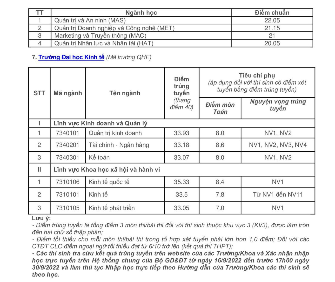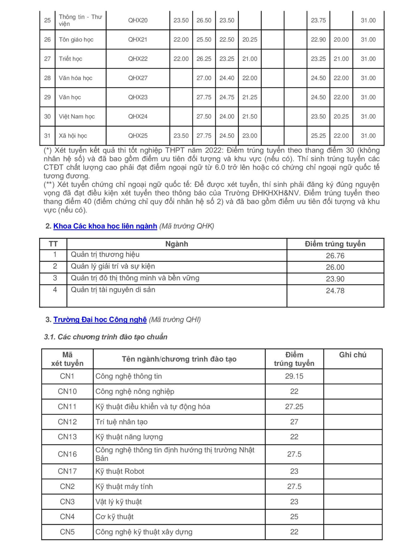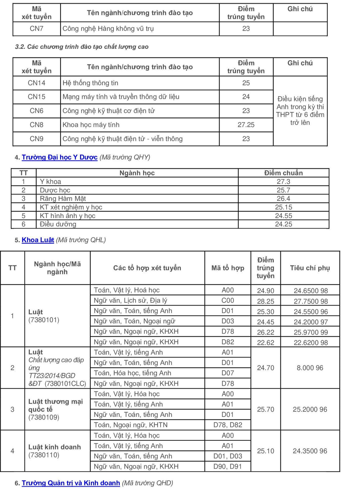 Điểm chuẩn cụ thể của 7 Trường ĐH/ Khoa trực thuộc ĐH Quốc gia Hà Nội như sau: