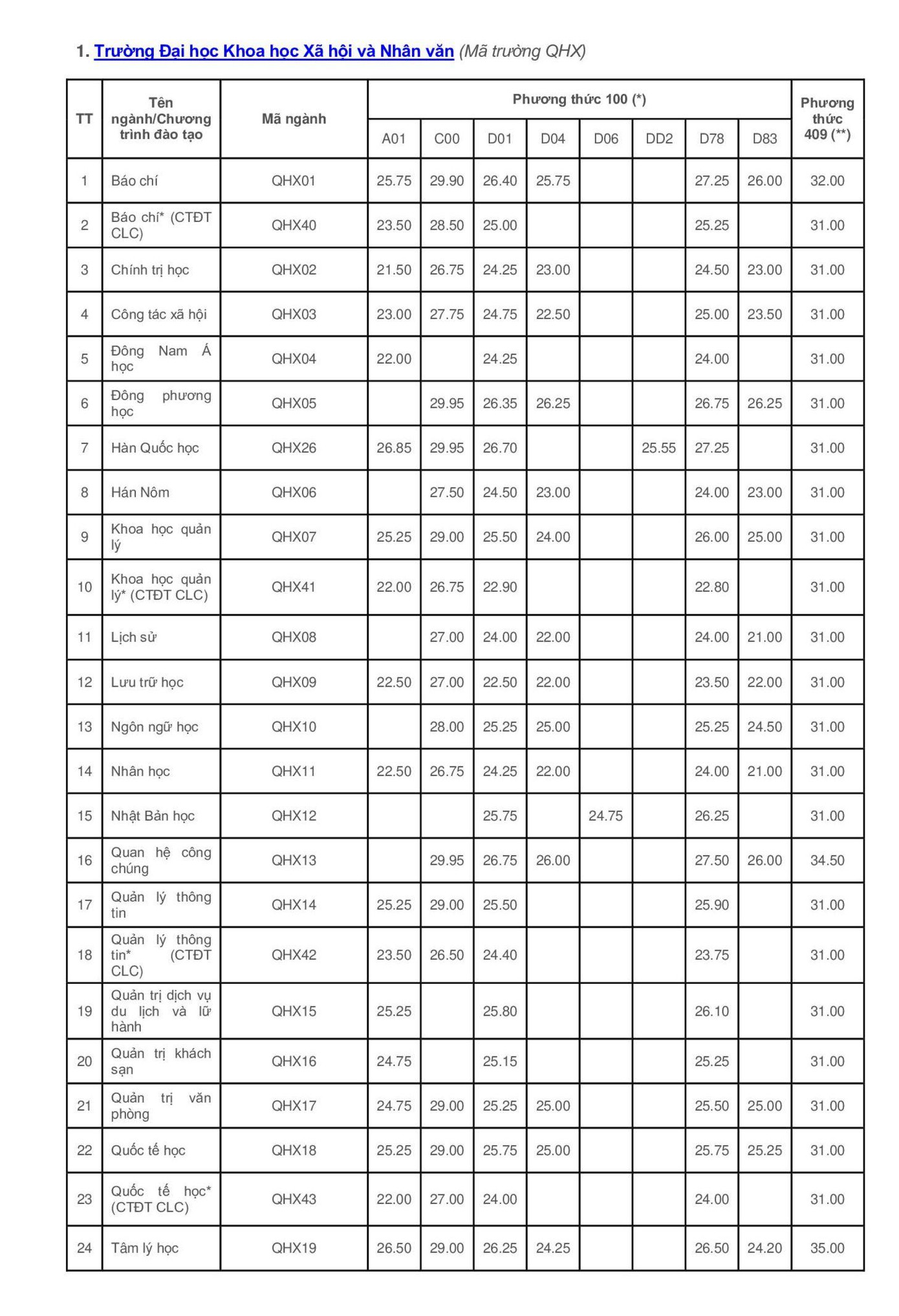 Một số ngành khác của Trường ĐH Khoa học Xã hội và Nhân văn điểm chuẩn ở tổ hợp C00 cũng rất cao, ở mức 29 điểm như Báo chí.