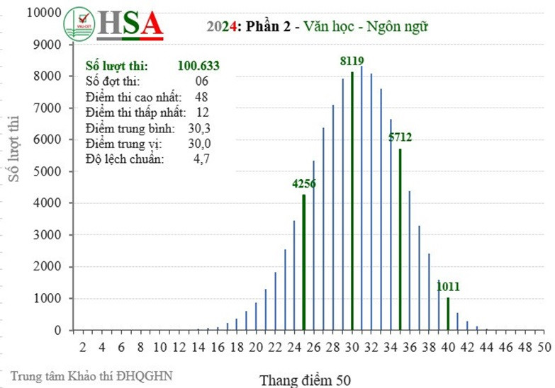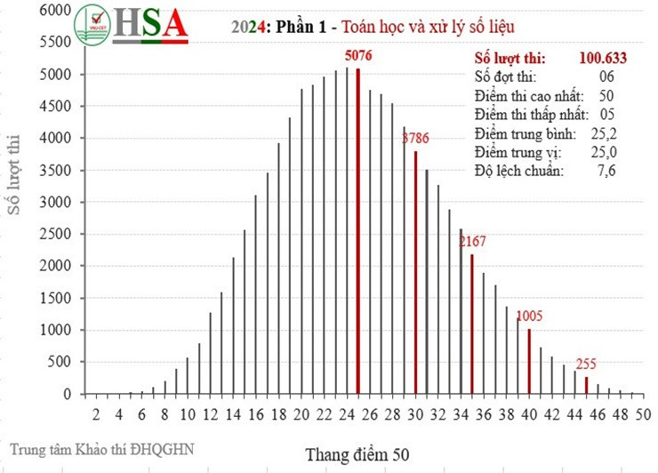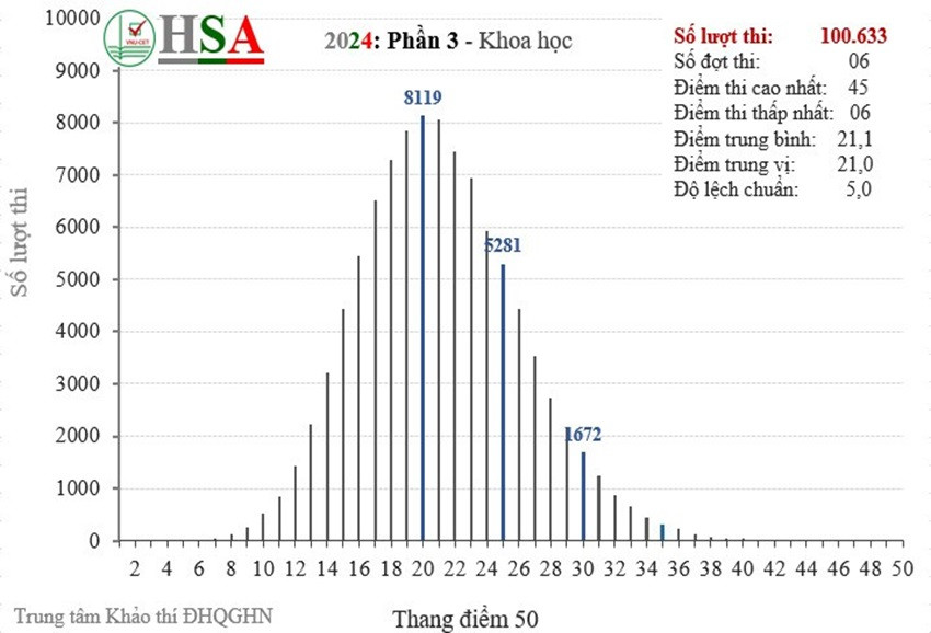 Điểm cao nhất của kỳ thi năm 2024 là 129/150; thấp nhất 17/150; điểm trung bình là 76,5/150; độ lệch chuẩn là 13,3. Ở các mức điểm cách nhau 5 đơn vị (75, 80, 85, 90, 95, 100, 105, 110…) có bước nhảy rõ rệt để phân loại thí sinh phục vụ xét tuyển sinh. Điểm trung và trung vị tương đối ổn định trong ba năm trở lại đây mặc dù số lượt thí sinh dự thi HSA tăng khoảng 15-25% mỗi năm.