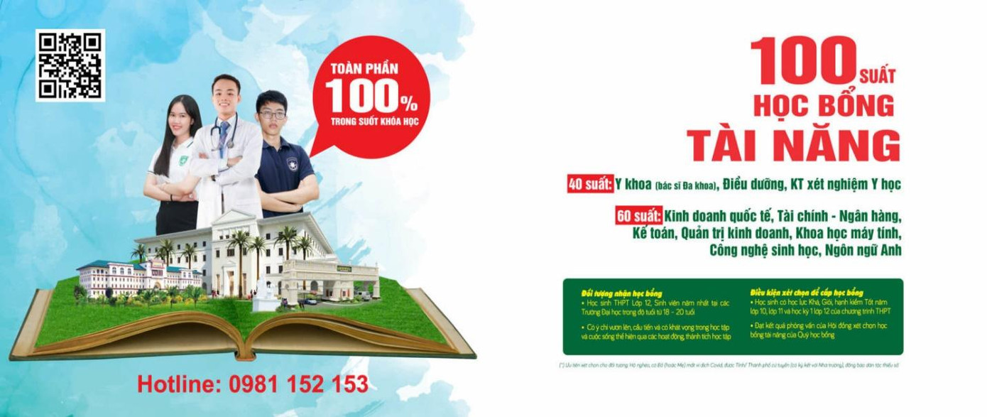Cụ thể, 30 suất học bổng toàn phần trị giá 150.000.000 đồng/ năm dành cho ngành Y Khoa, 10 suất học bổng toàn phần trị giá 40.000.000 đồng/ năm dành cho các ngành: Điều dưỡng, Kỹ thuật Xét nghiệm Y học. 60 suất học bổng toàn phần trị giá 25.000.000 đồng/năm (hệ tiếng việt) hoặc 40.000.000 đồng/ năm (hệ tiếng Anh) cho các ngành: Ngôn ngữ Anh, Khoa học máy tính, Kế toán, Tài chính – Ngân hàng, Kinh doanh quốc tế, Quản trị kinh doanh, Công nghệ sinh học.