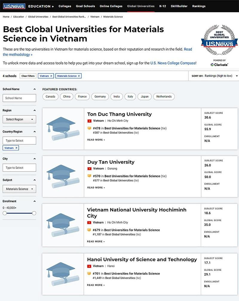Ở bảng xếp hạng theo các lĩnh vực chuyên môn, U.S.News & World Reports cũng ghi nhận nhiều trường đại học của Việt Nam. Ví dụ ở lĩnh vực Kỹ thuật & Công nghệ - Engineering, có sự góp mặt của 4 trường đại học Việt Nam, gồm trường Đại học Tôn Đức Thắng: vị trí 137; trường ĐH Duy Tân vị trí 355; trường Đại học Bách Khoa Hà Nội vị trí 650; ĐH Quốc gia TP.HCM vị trí 772.