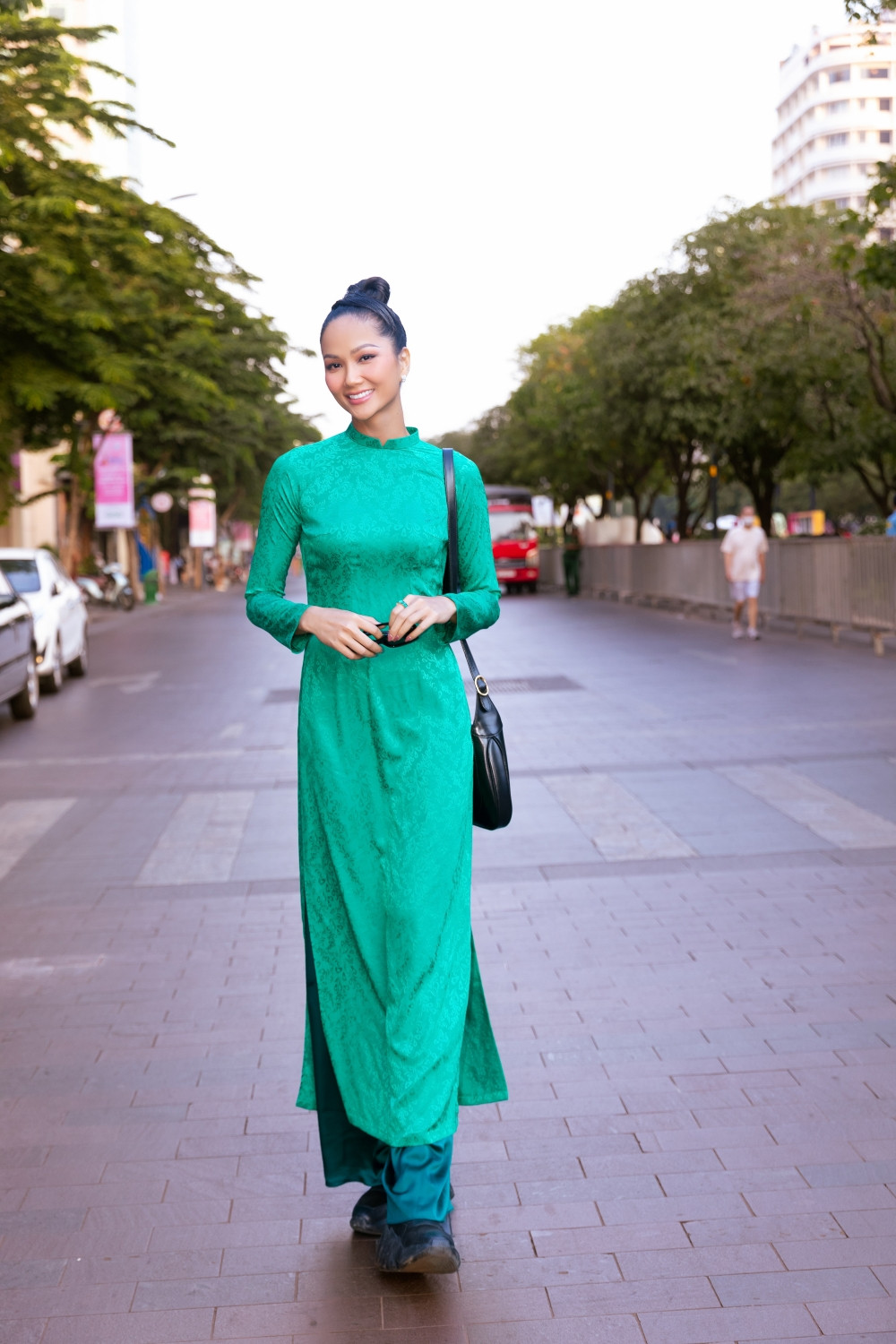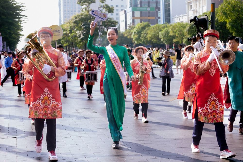 Nằm trong khuôn khổ Lễ hội Áo dài TP.HCM lần thứ 9, Hoa hậu H'Hen Niê cùng các đại sứ, khách mời đã có mặt tại phố đi bộ Nguyễn Huệ tham gia hoạt động diễu hành qua các con đường thành phố. Hoa hậu H'Hen Niê chọn áo dài màu xanh lá cây, tóc búi đơn giản, mang giày thể thao, hòa cùng dòng người.