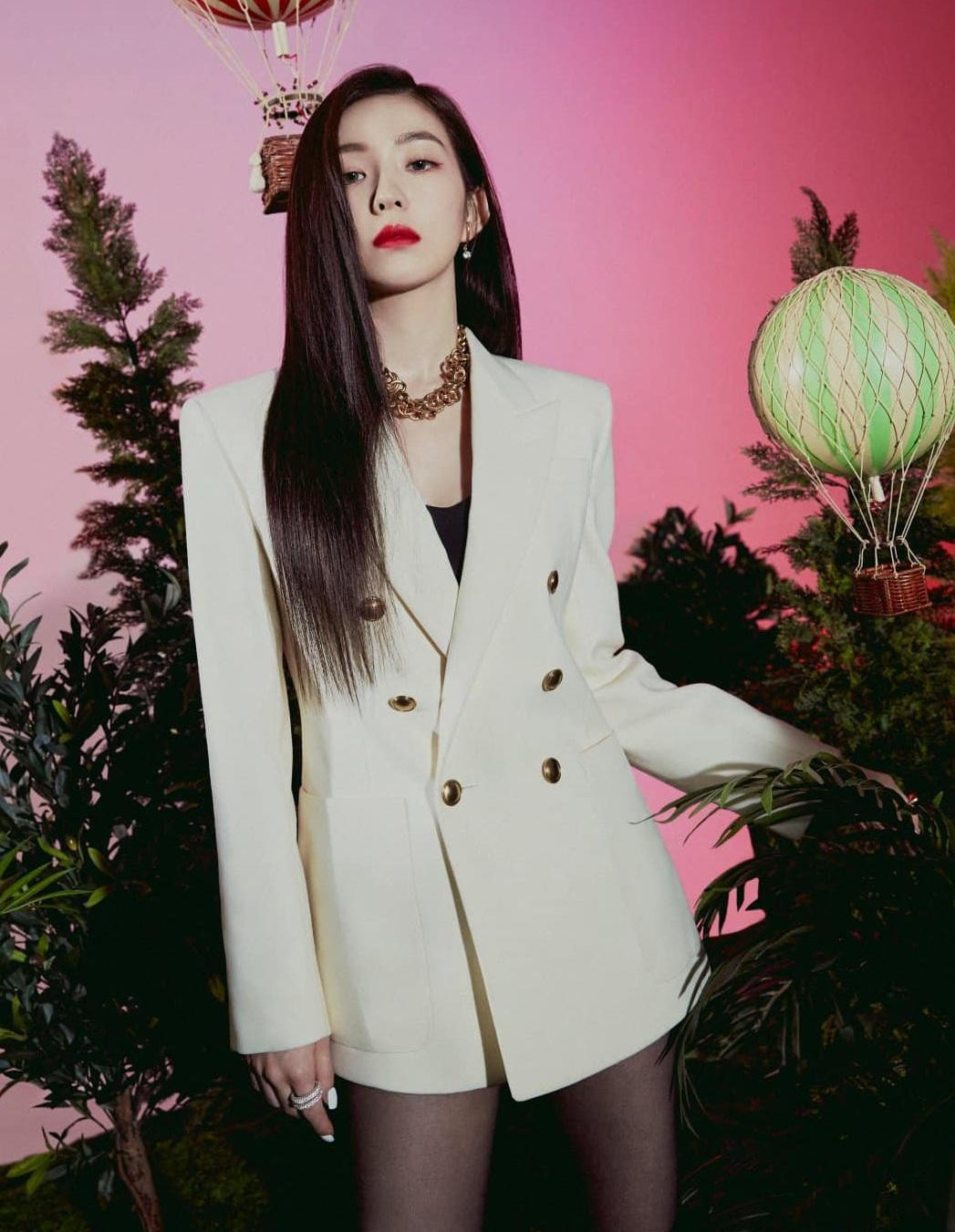 Gần một năm sau, Irene có màn đụng hàng với Rosé khi nhóm Red Velvet tung ra mini album mới. Trong một bộ ảnh quảng cáo, Irene diện cùng thiết kế blazer này nhưng khác màu và mặc theo mốt áo giấu quần.