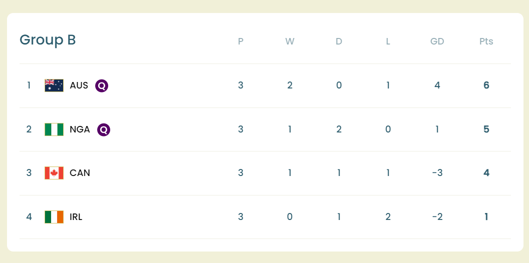 Bảng xếp hạng chung cuộc bảng B World Cup nữ 2023