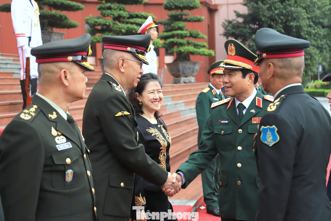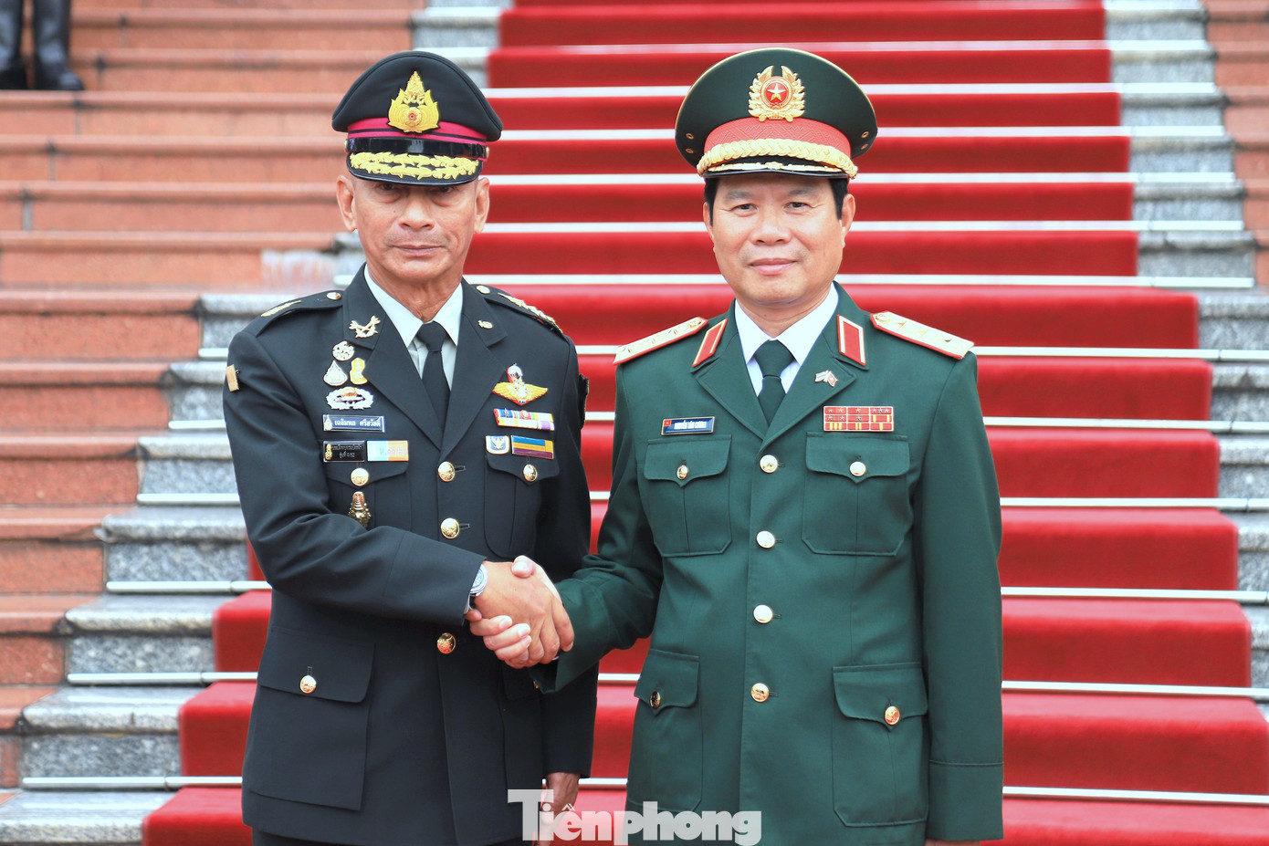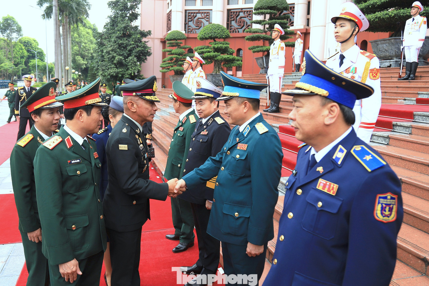 | Tổng Tham mưu trưởng Nguyễn Tân Cương đón Tư lệnh Lực lượng Quốc phòng Quân đội Hoàng gia Thái Lan Chalermphon Srisawasdi tới trụ sở Bộ Quốc phòng hội đàm, sáng 20/9. |
