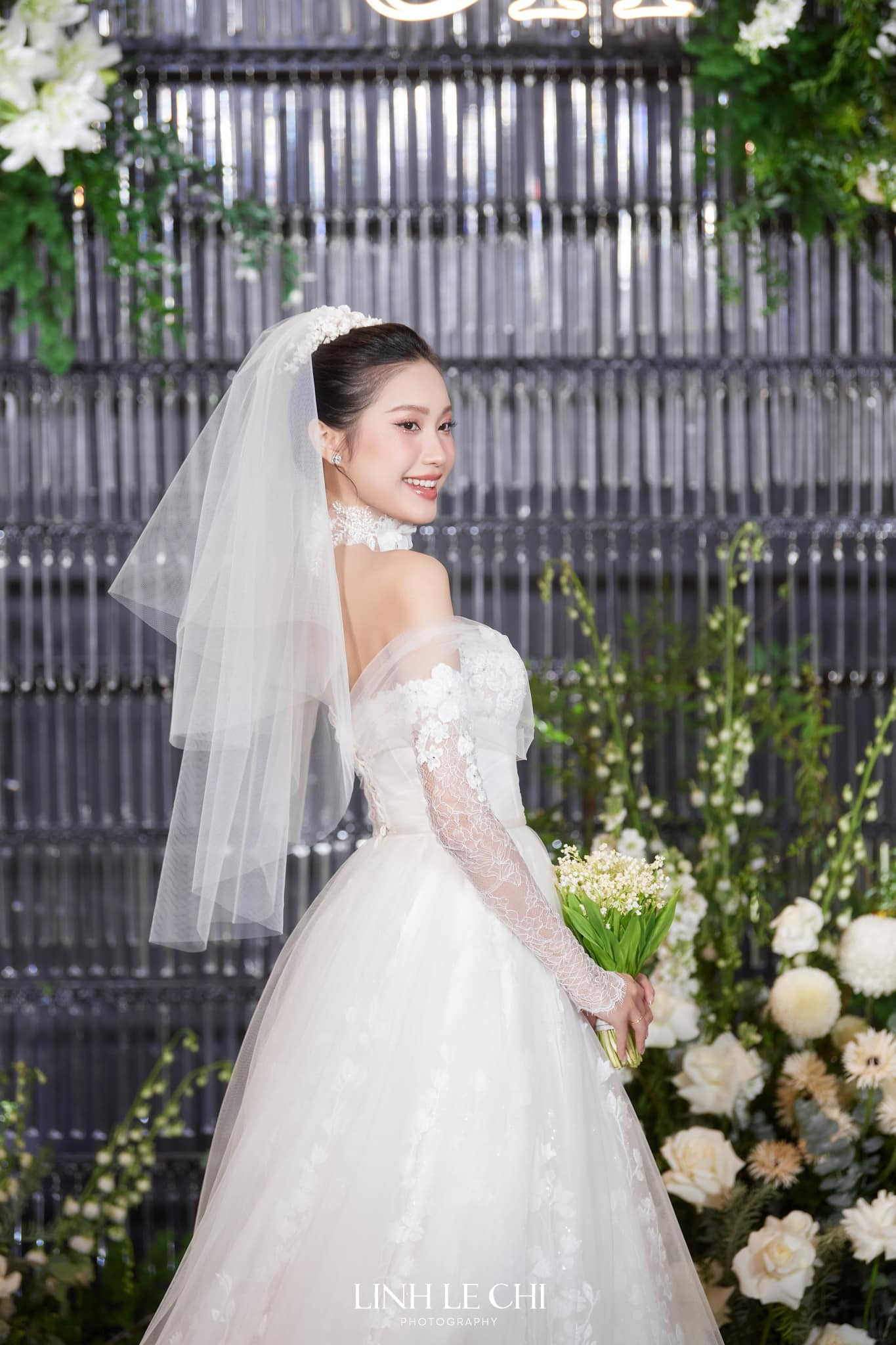 Khi thay bộ váy thứ ba để đến các bàn tiệc, Doãn Hải My vẫn không rời bó hoa linh lan xinh xắn.