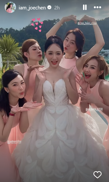 Cô dâu Trần Kiều Ân khoe sắc trong váy cưới tinh khôi trên Story Instagram. Đội hình phù dâu được tiết lộ là những người bạn lâu năm của cô, gồm Triệu Tiểu Kiều, Lại Vy Như, Khâu Vỹ Phân, Khuất Mân Khiết. Về phía đội phù rể có sự tham gia của Minh Đạo, Trịnh Nguyên Sướng và chồng của Lại Vy Như.
