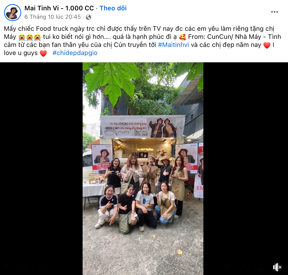 Đáng chú ý, thể hiện tinh thần kết nối giữa hai mùa, FC của “lớp trưởng” Diệp Lâm Anh (mùa 1) đã gửi food truck đến trường quay Chị Đẹp Đạp Gió 2024 để cổ vũ “lớp phó” Mai Tinh Vi (mùa 2) trên hành trình chinh phục thử thách mới.