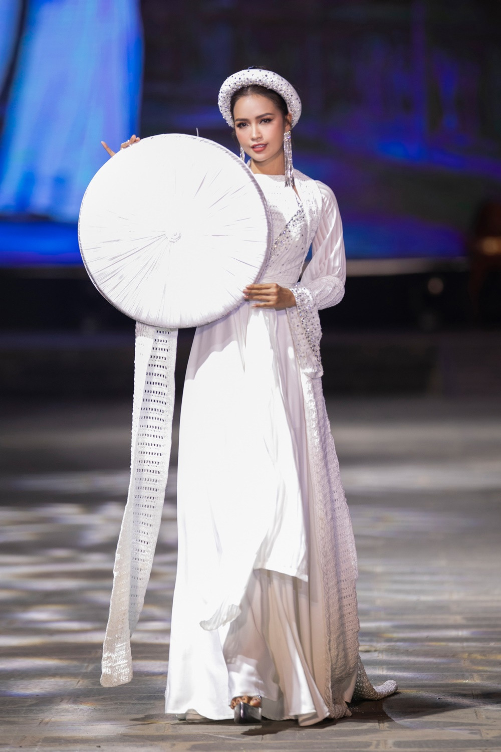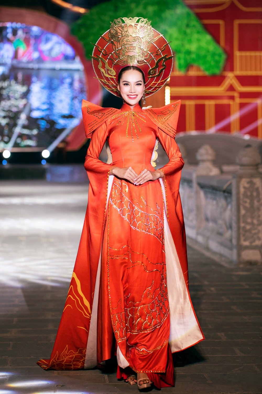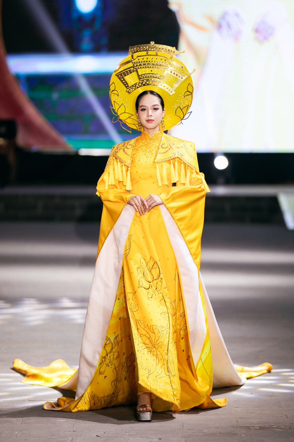 Hoa hậu Hoàn vũ Việt Nam 2022 Nguyễn Thị Ngọc Châu trong thiết kế áo tứ thân cách điệu, thuộc BST Yếm Xuân của NTK Việt Hùng.
