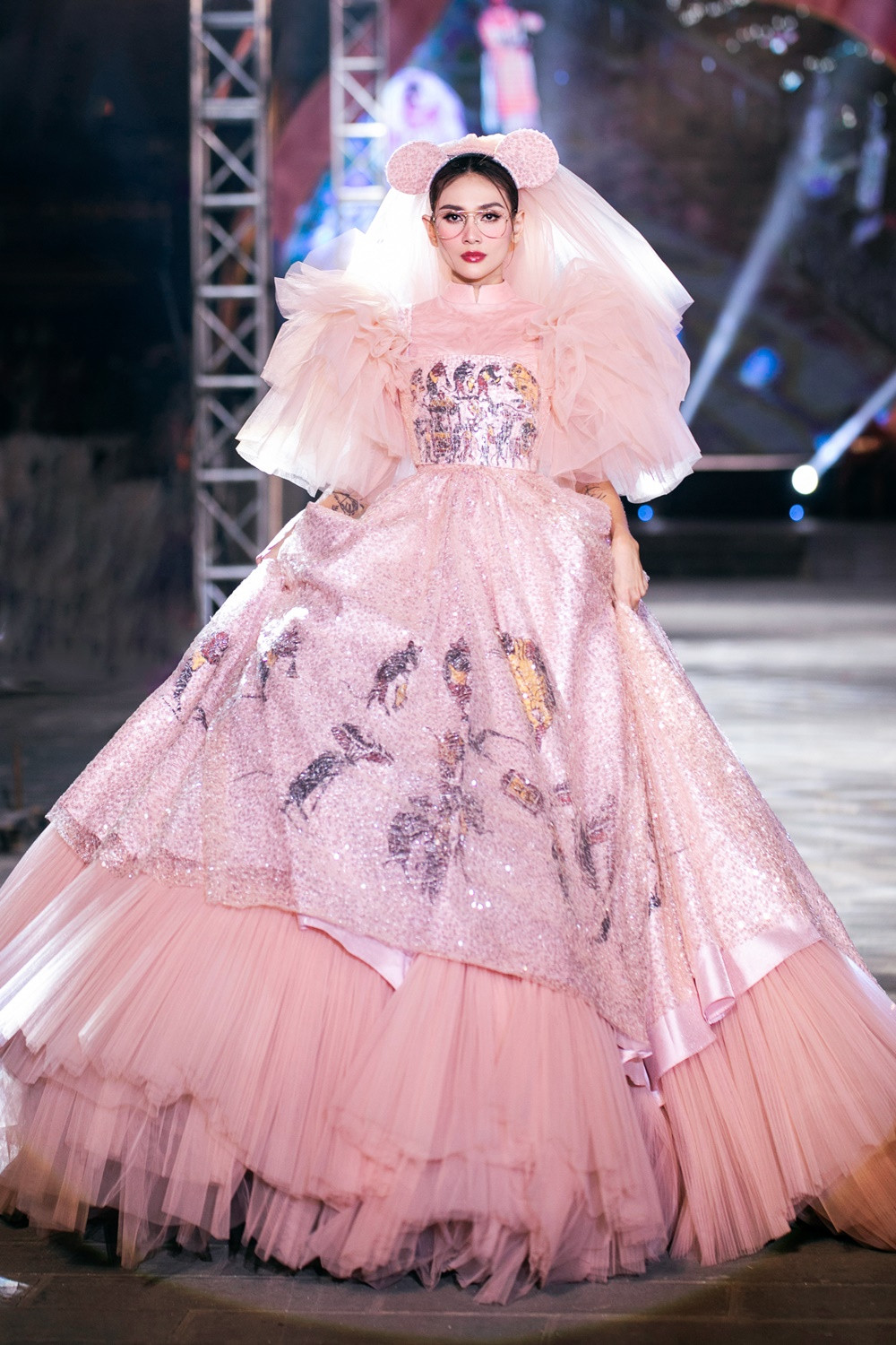 Á hậu, siêu mẫu Võ Hoàng Yến đảm nhận vị trí vedette, bước ra lộng lẫy trong thiết kế “cô dâu chuột” thuộc BST Nét Dân Gian của NTK Nguyễn Minh Công. Võ Hoàng Yến cũng xuất hiện trong BST của NTK Thạch Linh.