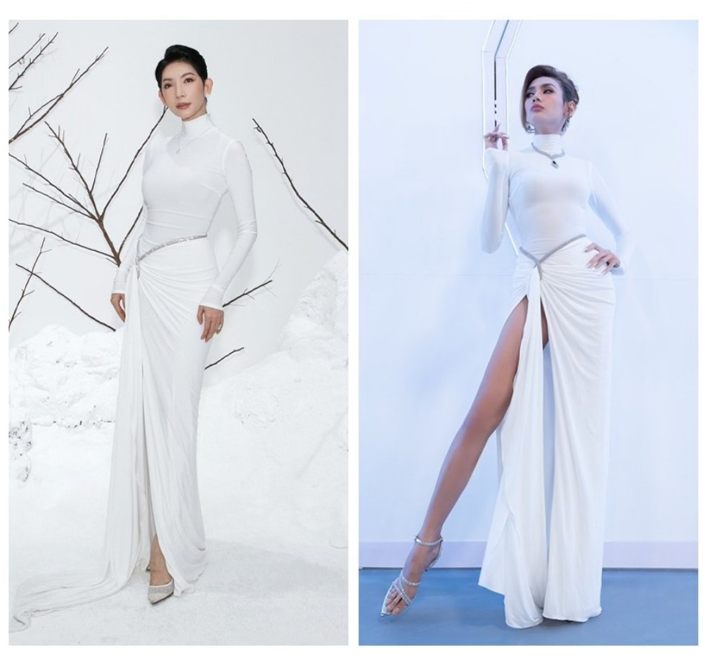 Hoa hậu Hoàn Vũ Việt Nam 2022 Nguyễn Thị Ngọc Châu là người đẹp diện thiết kế này gần đây nhất, trong buổi khai mạc Liên hoan phim Quốc tế TP.HCM. Cô là người đẹp duy nhất không vấn tóc khi mặc mẫu váy này. Hoa hậu Ngọc Châu trang điểm vô cùng sắc sảo, đeo trang sức bạc cùng tông với thắt lưng.
