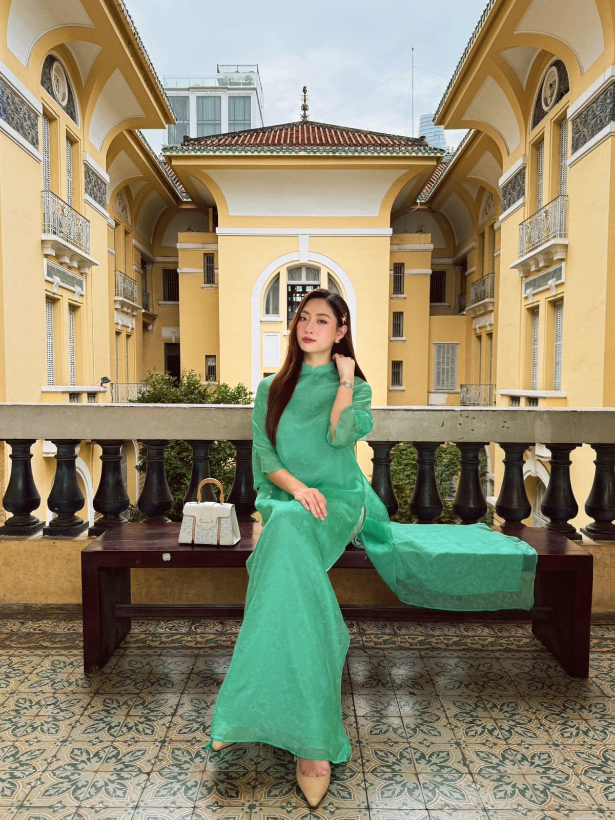 Hoa hậu Lương Thùy Linh chọn áo dài màu xanh lá để chúc mừng năm mới 2025.