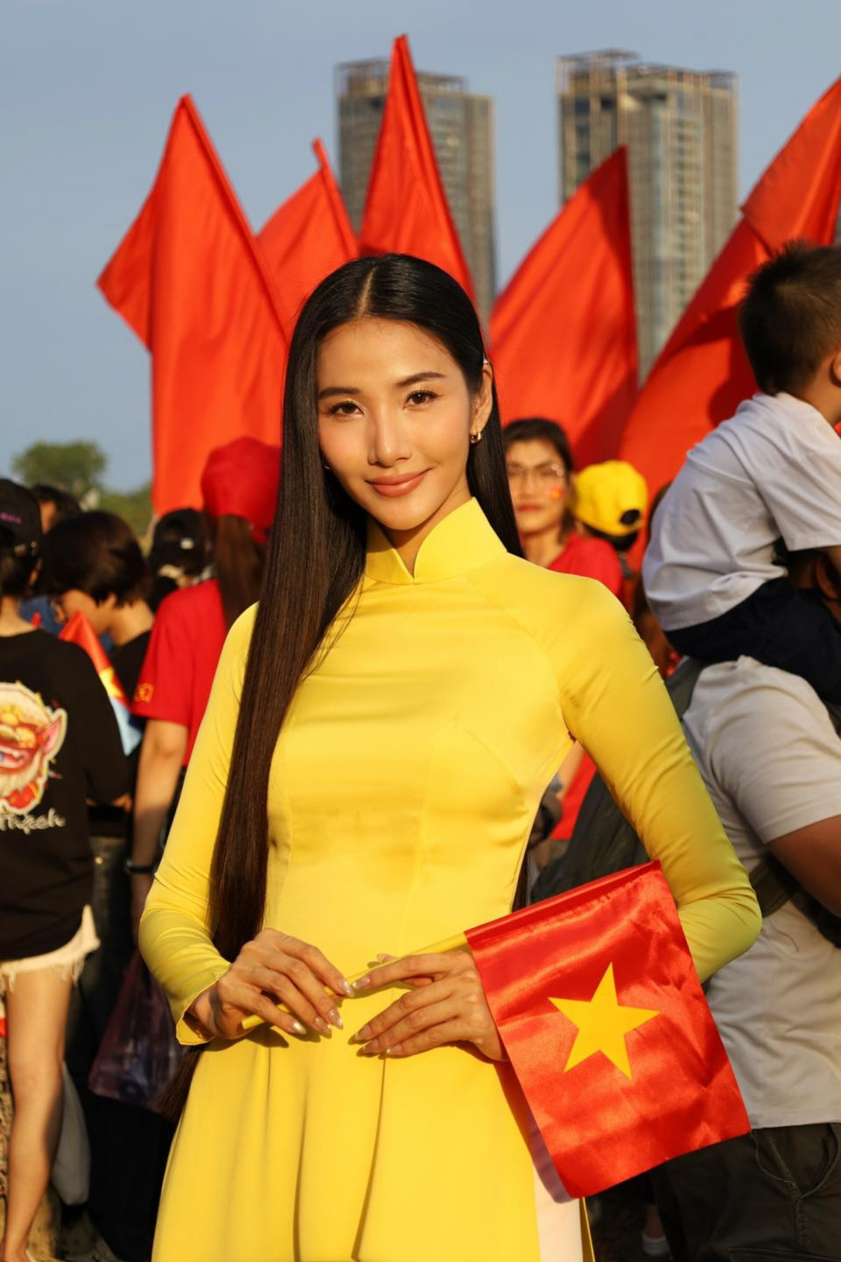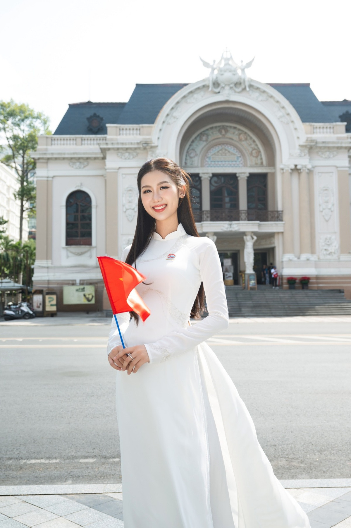 Á hậu 1 Hoa hậu Hoàn vũ Việt Nam 2029 - Á hậu 2 Miss Supranational 2022 Nguyễn Huỳnh Kim Duyên chọn áo dài trắng và khăn rằn giống như nhiều nàng hậu khác.