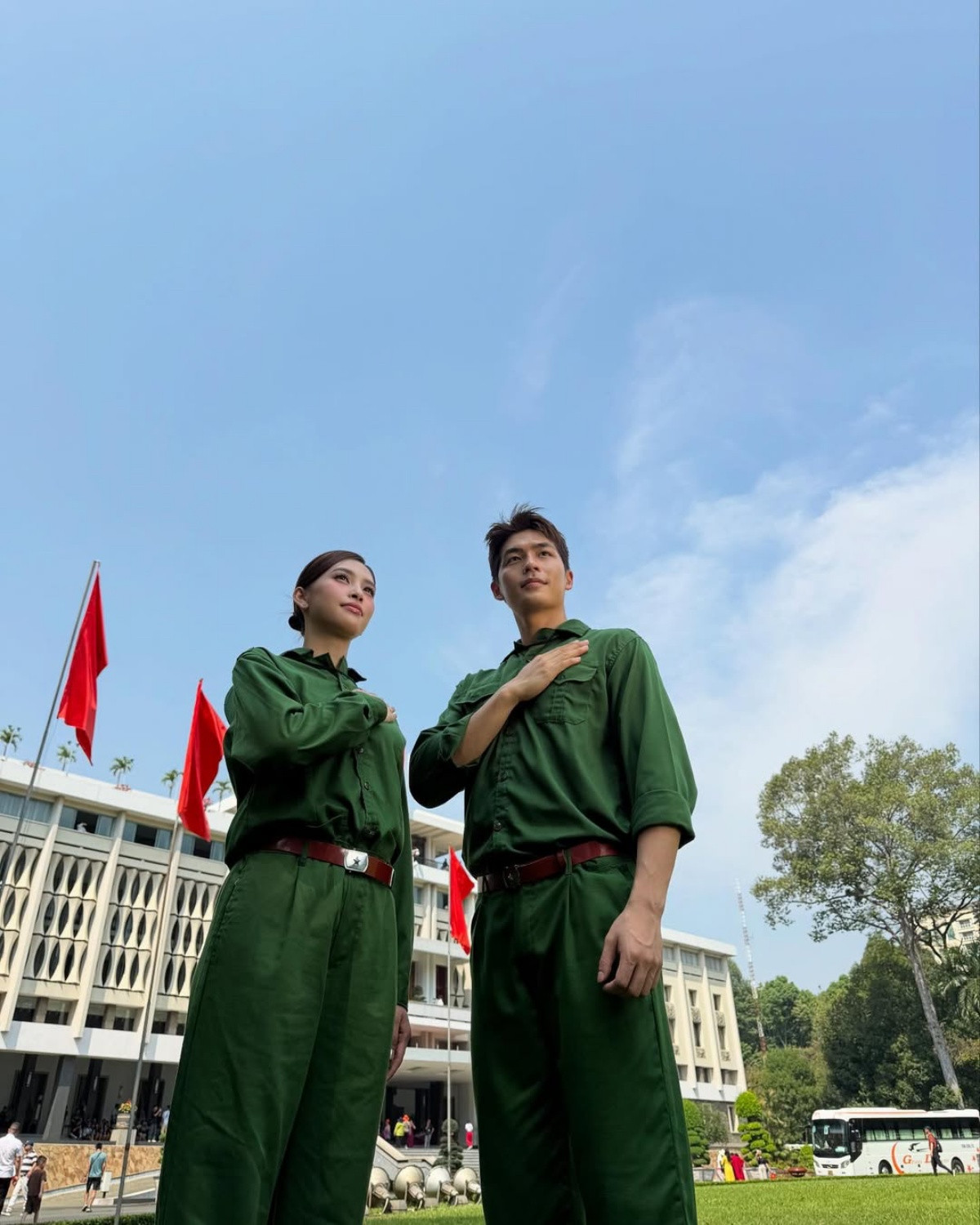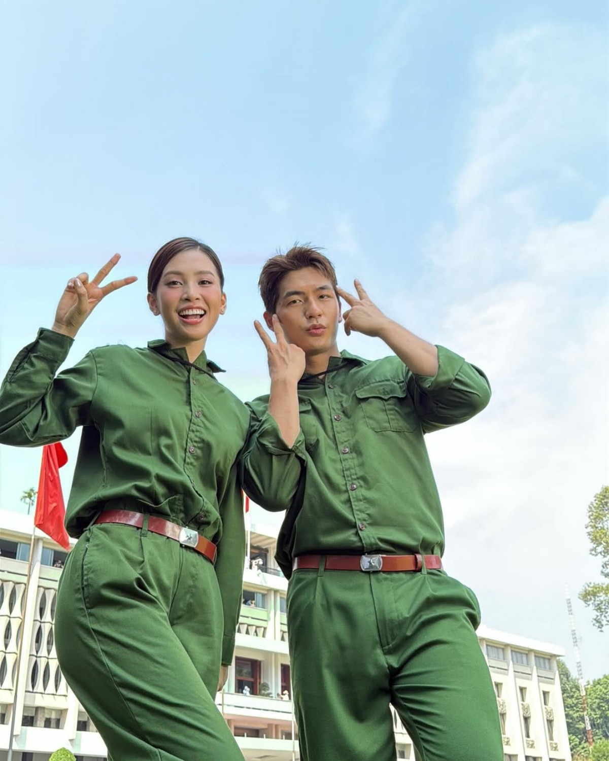 Ấn tượng nhất là bộ ảnh Hoa hậu Tiểu Vy mặc trang phục bộ đội, chụp cùng diễn viên Quốc Anh.