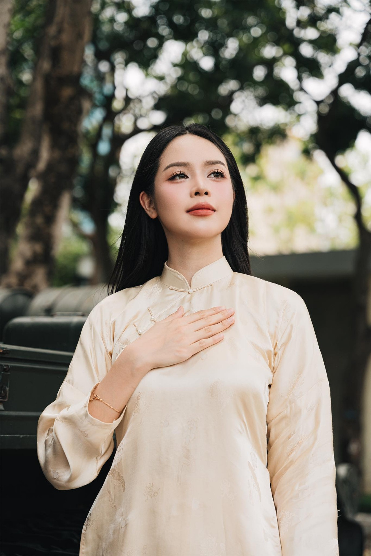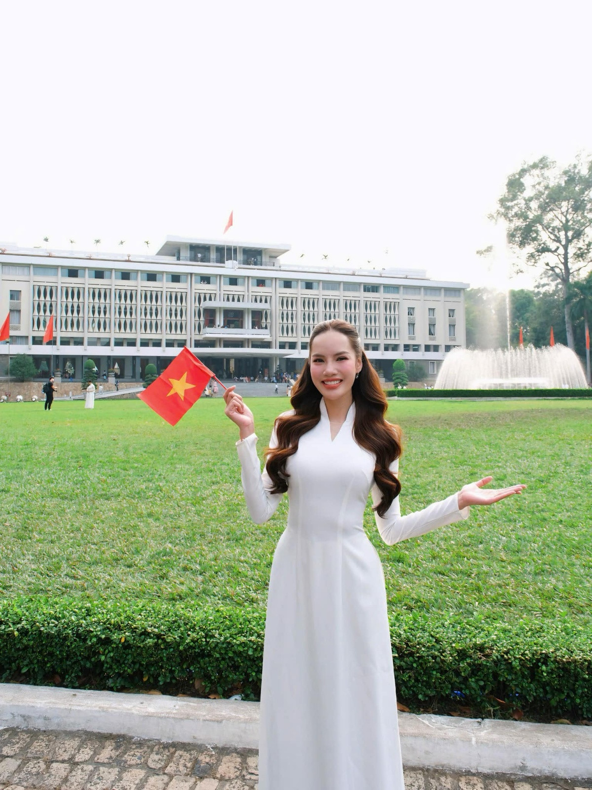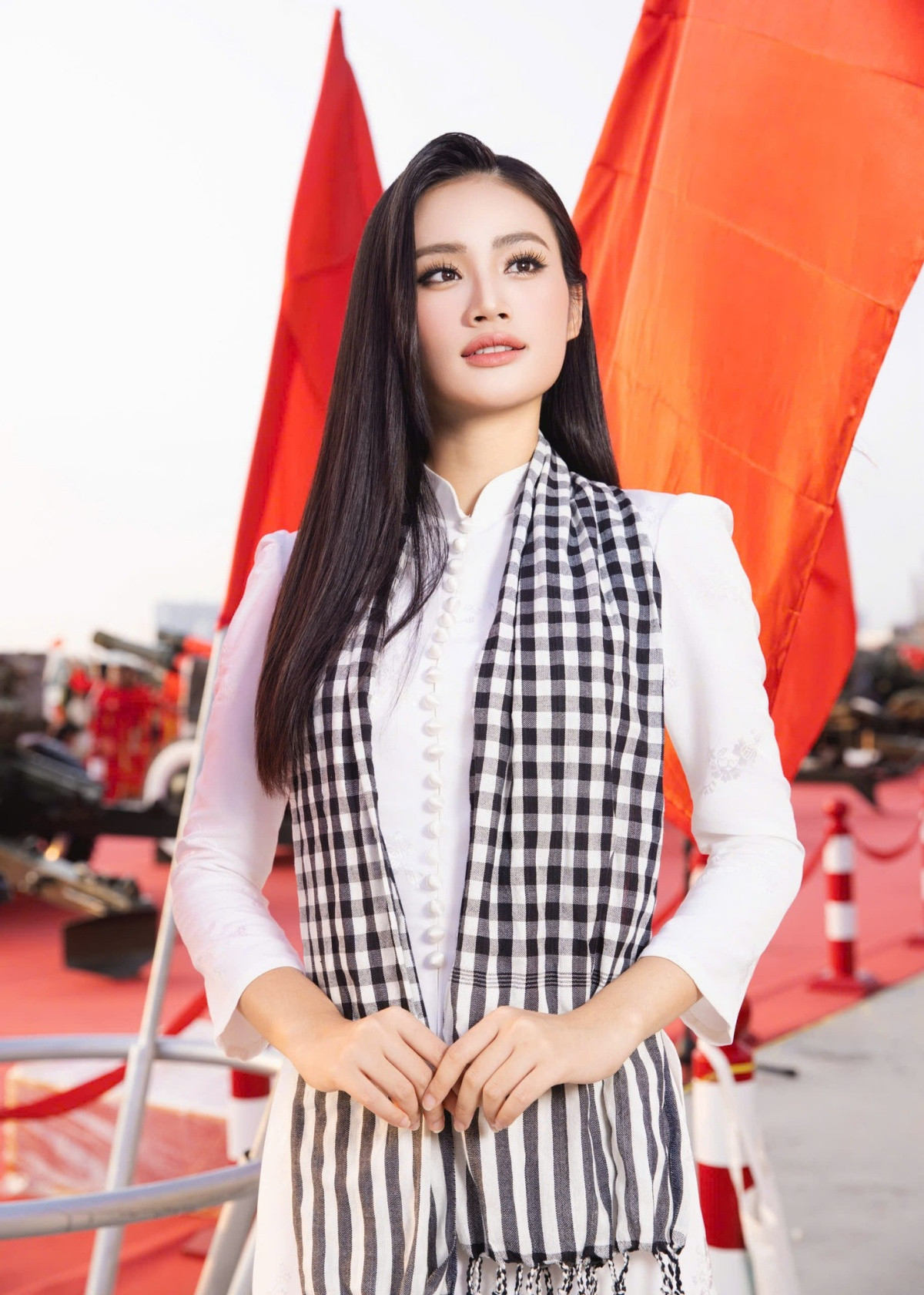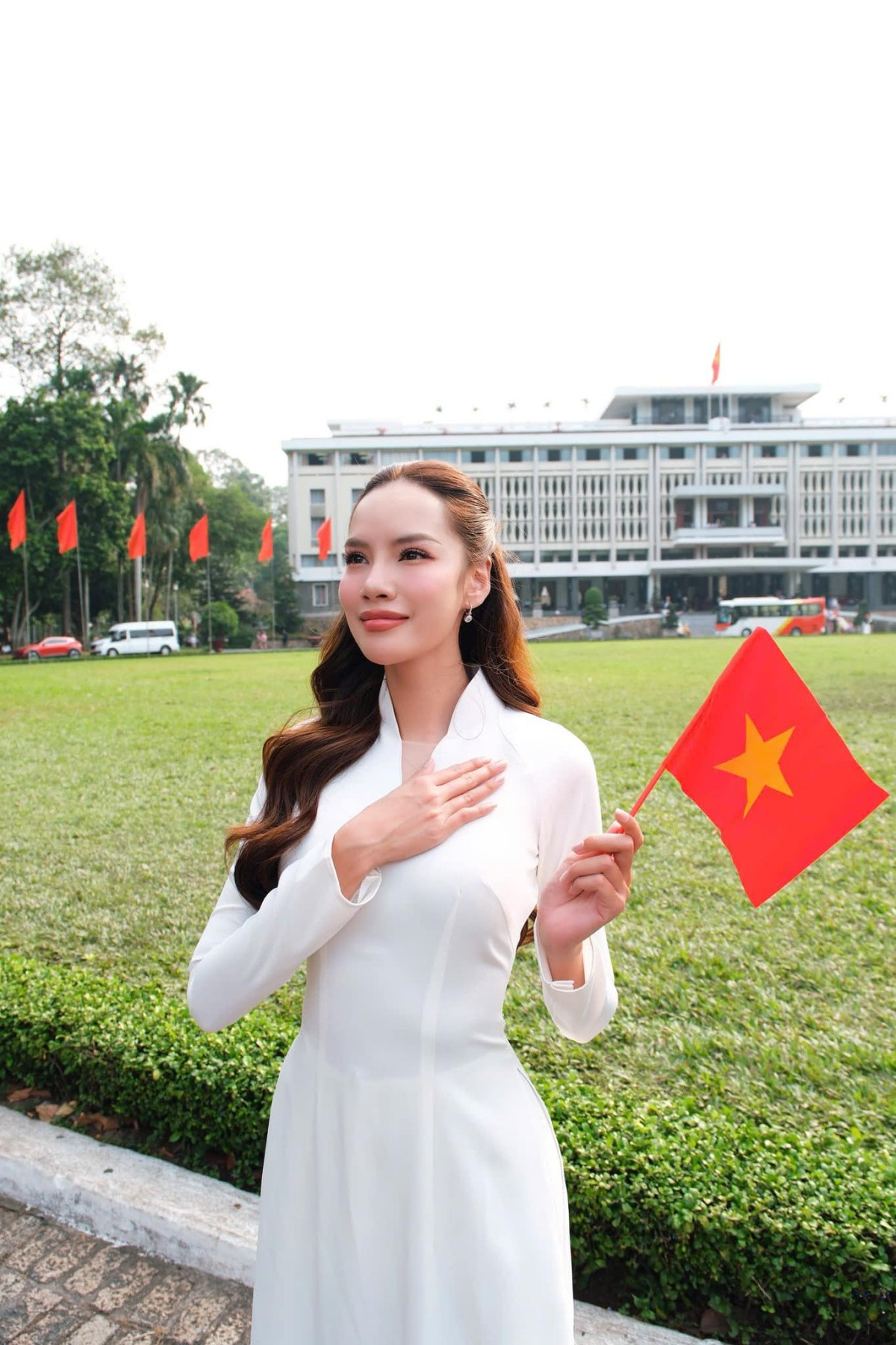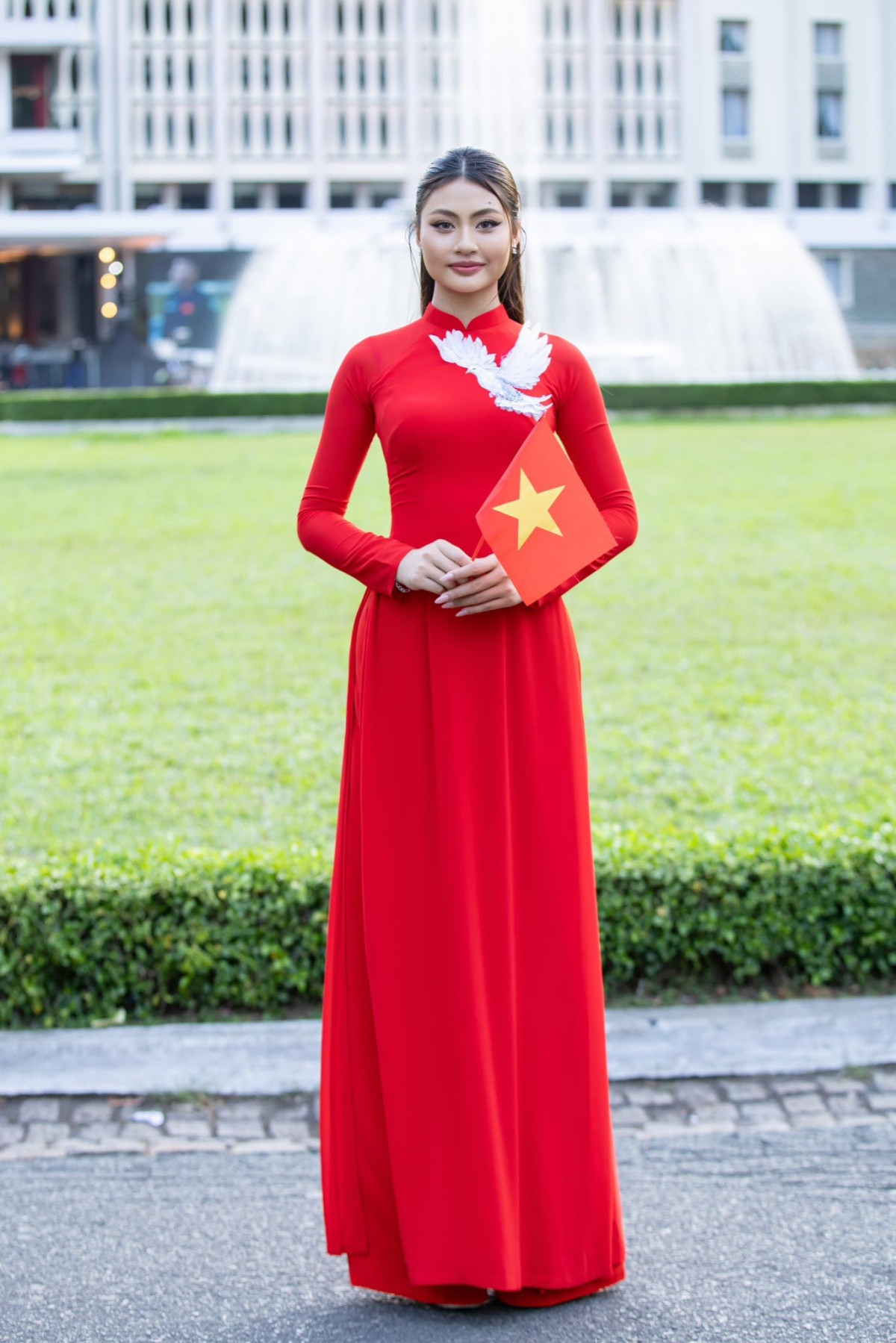 Hoa hậu Việt Nam 2022 - Miss International 2024 Huỳnh Thị Thanh Thủy mặc áo dài cầm lá cờ Tổ quốc với lòng biết ơn và tự hào về thế hệ cha ông.