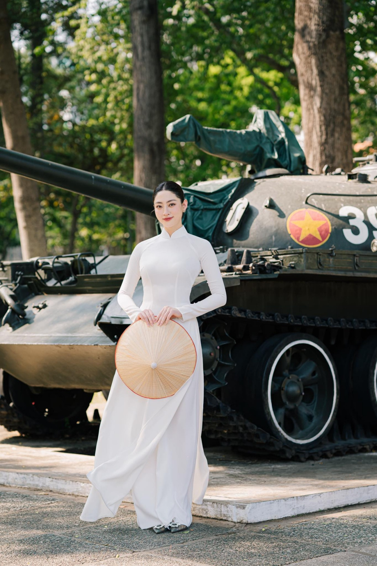 Miss World Vietnam 2019 Lương Thùy Linh cũng chọn áo dài trắng, cờ tổ quốc và nón lá, nàng hậu chụp cùng chiếc xe tăng huyền thoại.