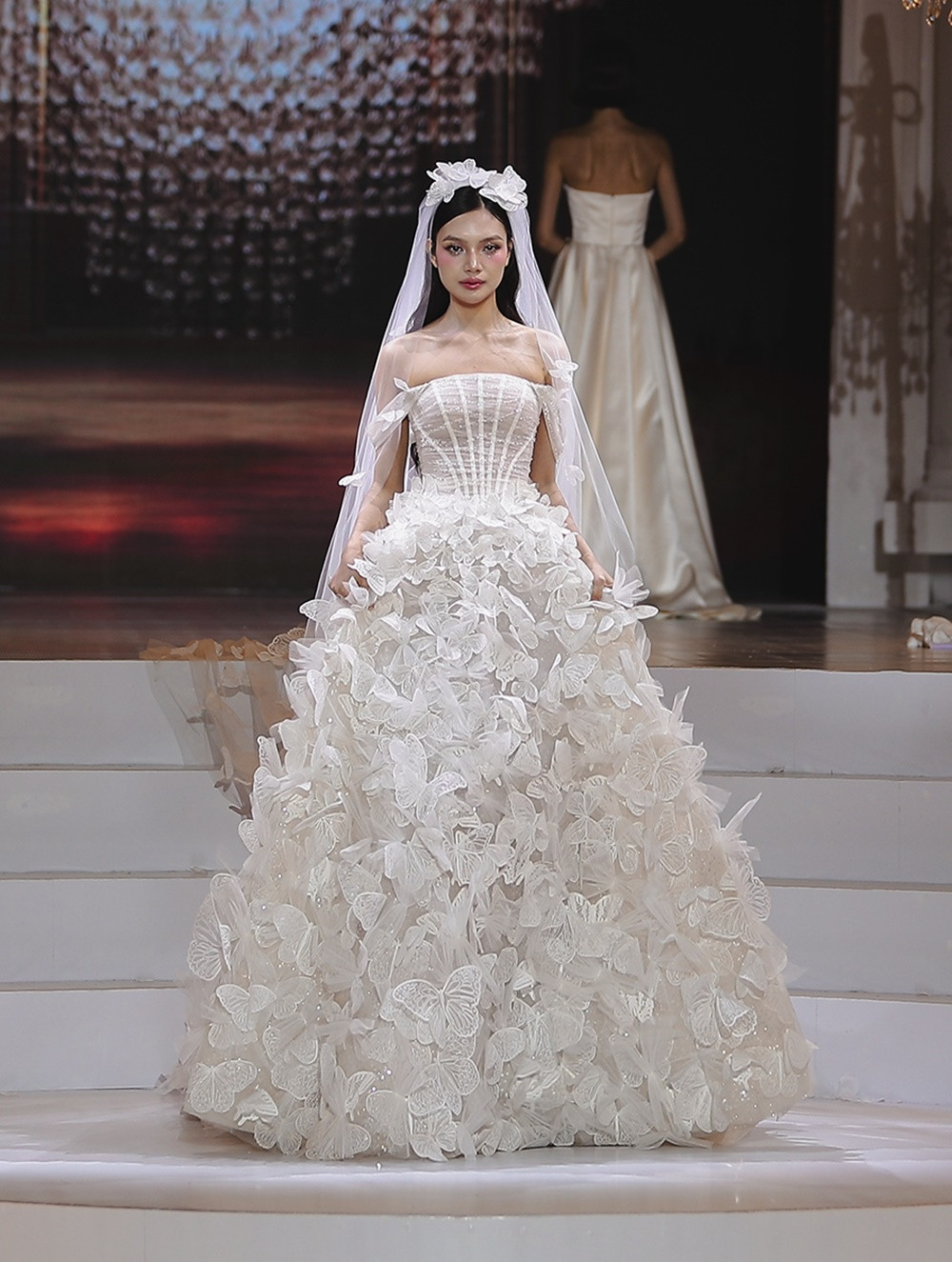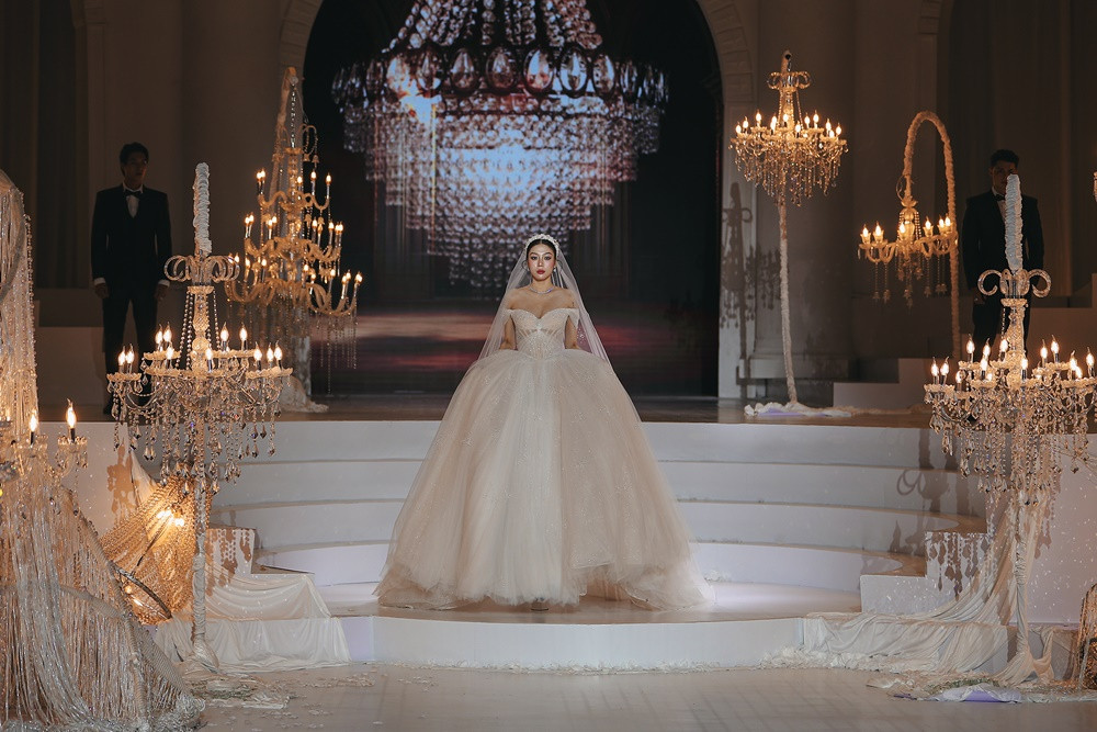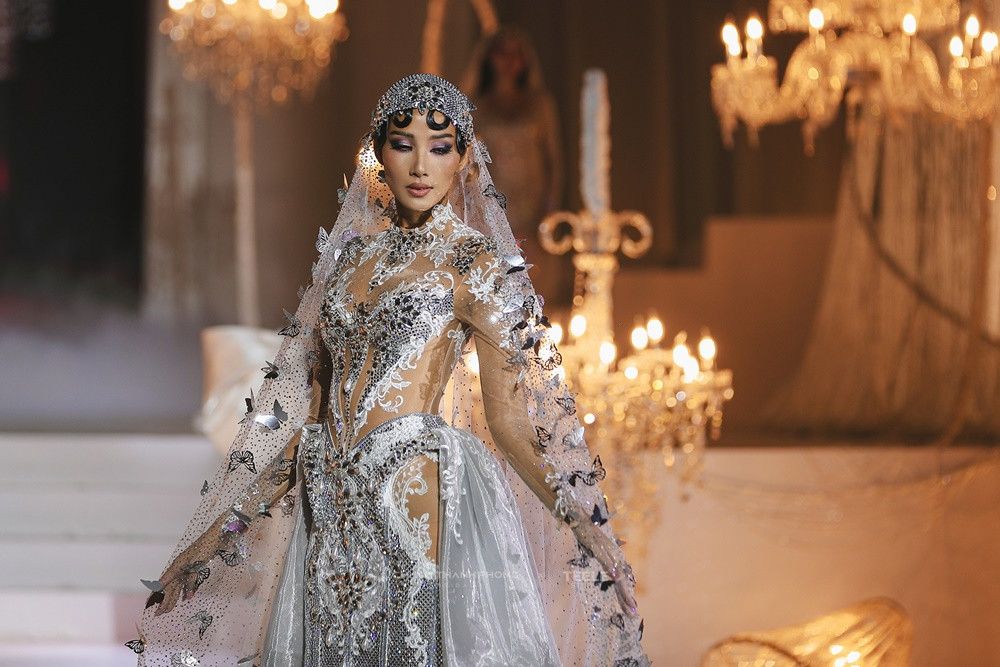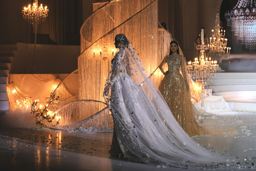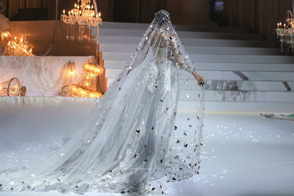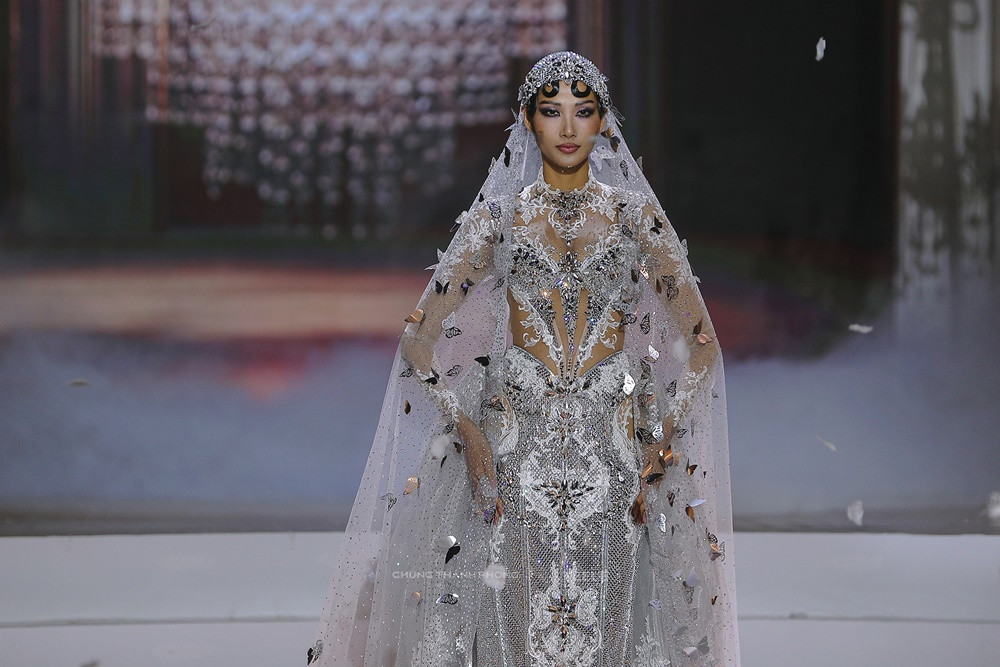 Cao trào được đẩy lên đỉnh điểm khi Á hậu Hoàng Thùy xuất hiện cuối cùng trong chiếc đầm xuyên thấu phủ kín đá Swarovski lấp lánh. Tấm khăn voan dài ba mét, đính đá, kim sa và những cánh bướm cắt laser thủ công giúp Hoàng Thùy mang vẻ đẹp yêu kiều của một cô dâu những năm 1920.
