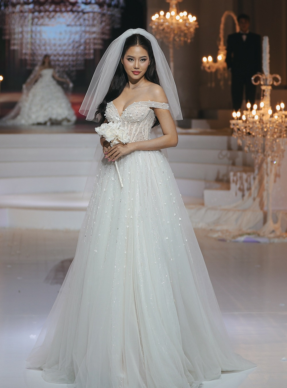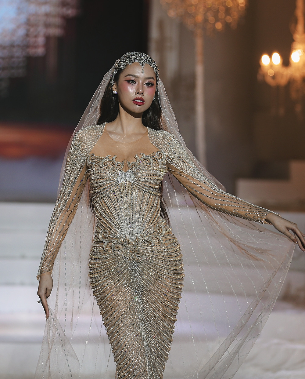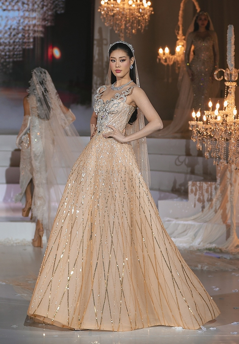 Cao trào được đẩy lên đỉnh điểm khi Á hậu Hoàng Thùy xuất hiện cuối cùng trong chiếc đầm xuyên thấu phủ kín đá Swarovski lấp lánh. Tấm khăn voan dài ba mét, đính đá, kim sa và những cánh bướm cắt laser thủ công giúp Hoàng Thùy mang vẻ đẹp yêu kiều của một cô dâu những năm 1920.