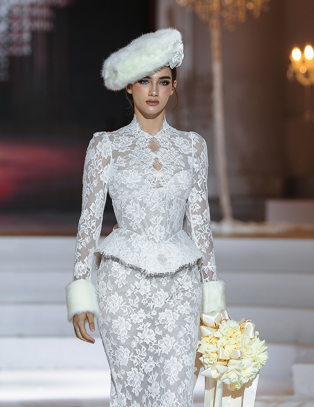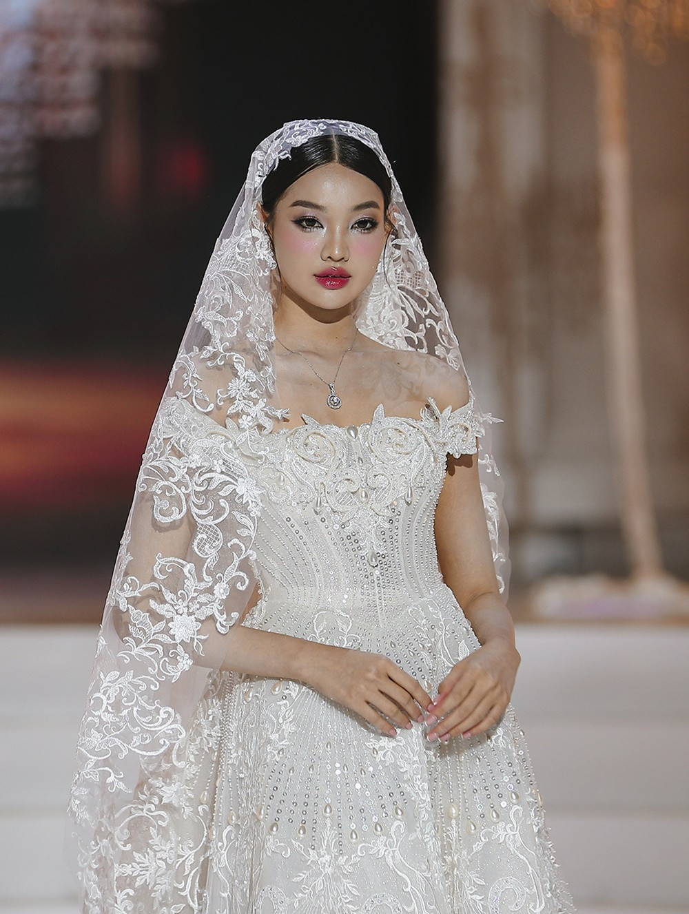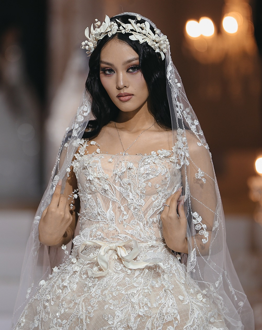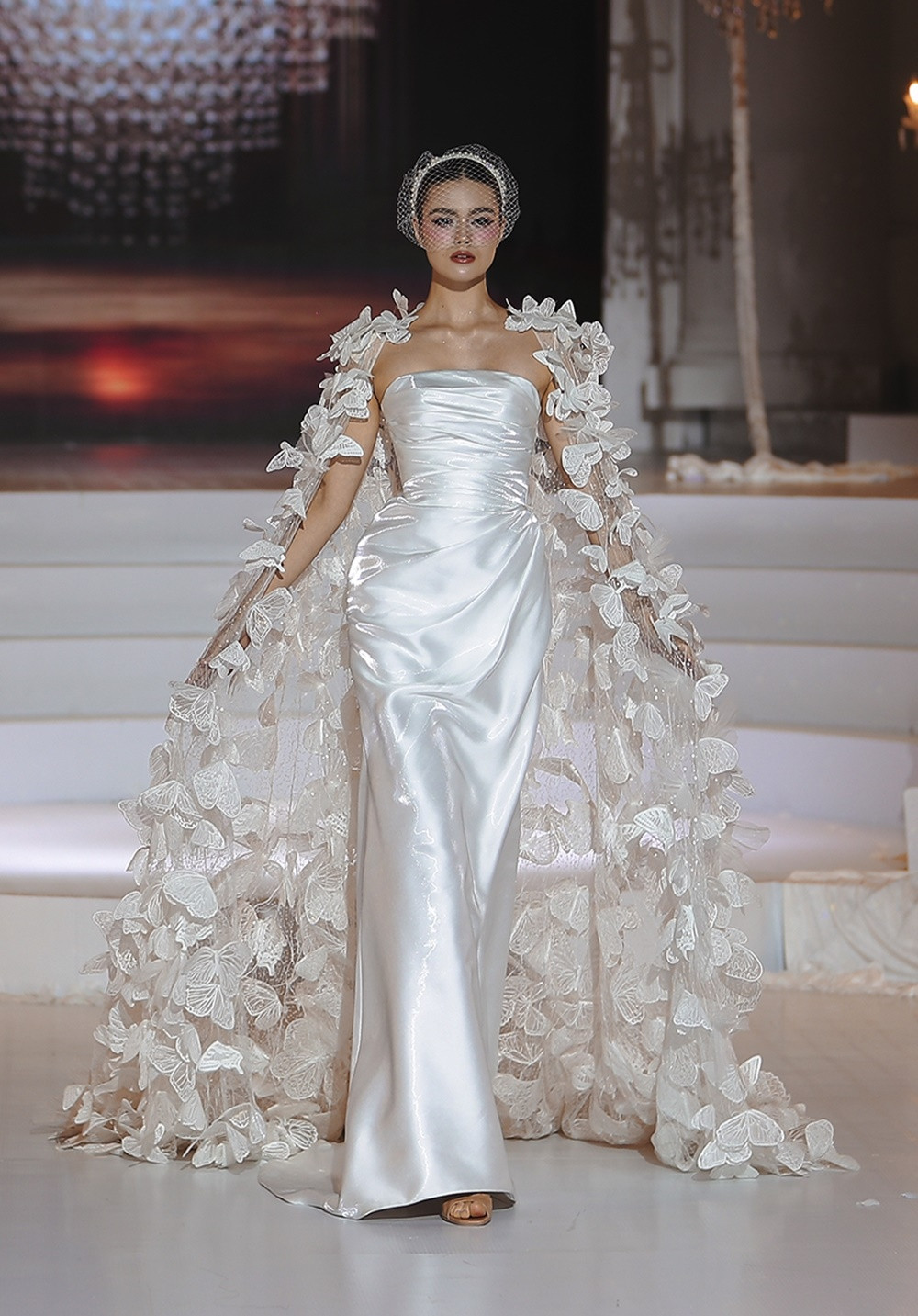 Cao trào được đẩy lên đỉnh điểm khi Á hậu Hoàng Thùy xuất hiện cuối cùng trong chiếc đầm xuyên thấu phủ kín đá Swarovski lấp lánh. Tấm khăn voan dài ba mét, đính đá, kim sa và những cánh bướm cắt laser thủ công giúp Hoàng Thùy mang vẻ đẹp yêu kiều của một cô dâu những năm 1920.