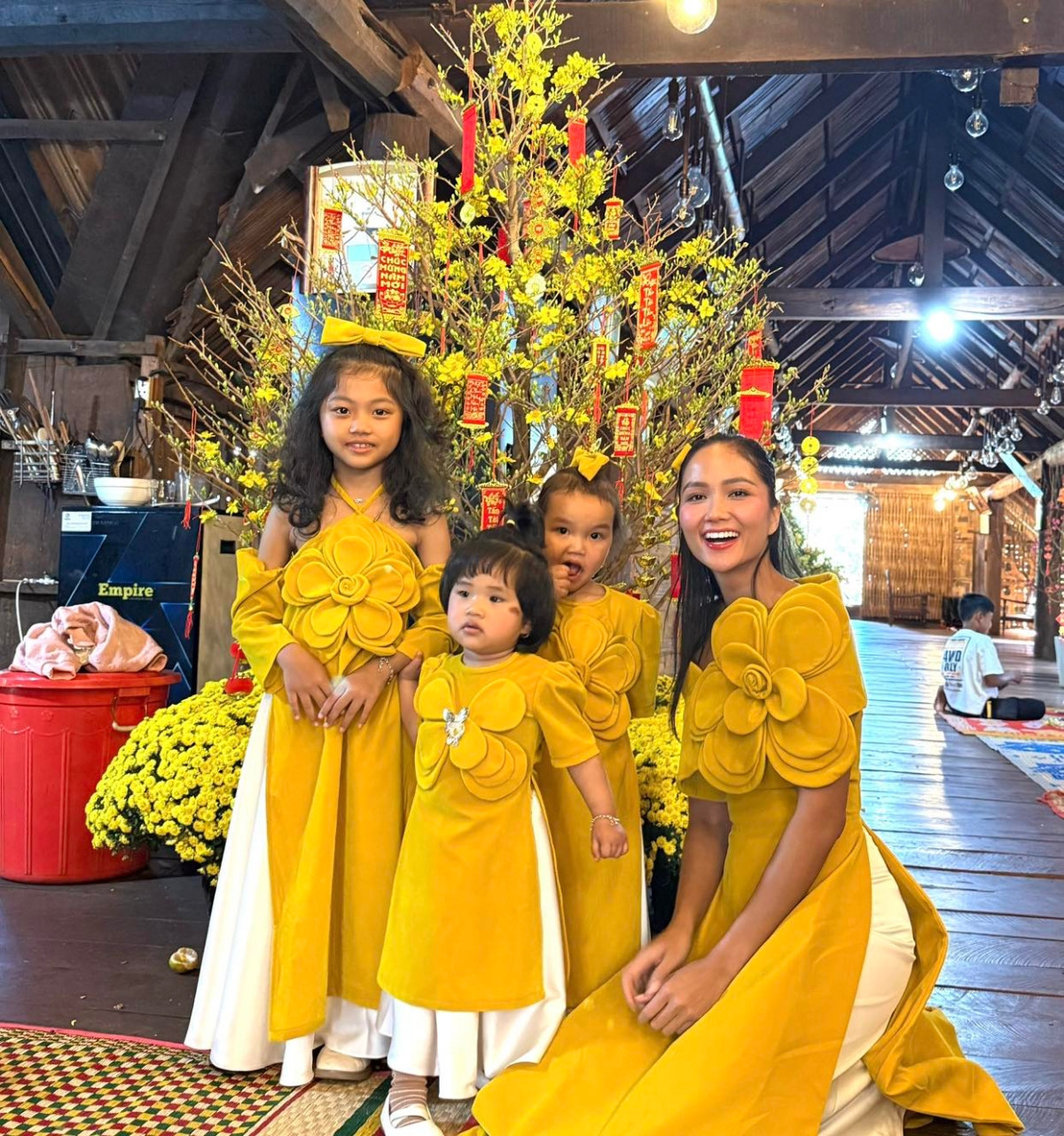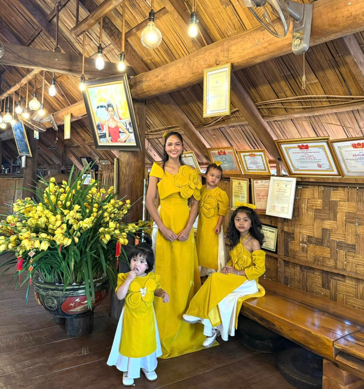 Hoa hậu H'Hen Niê mặc áo dài vàng "đồng phục" cùng dàn cháu gái xinh xắn tại quê nhà.