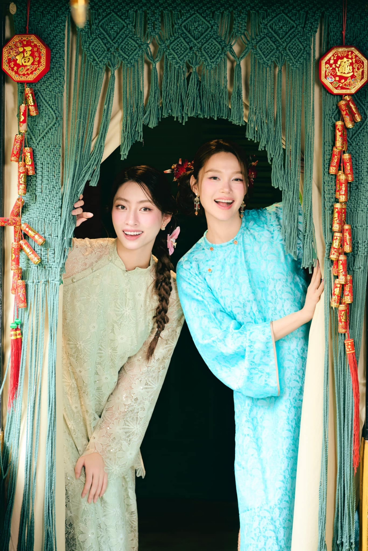 Hoa hậu Lương Thùy Linh có bộ ảnh xinh đẹp cùng nhân vật bất ngờ là diễn viên, ca sĩ Minh Hằng. Hai người đẹp chọn áo dài tông màu xanh dịu mắt.