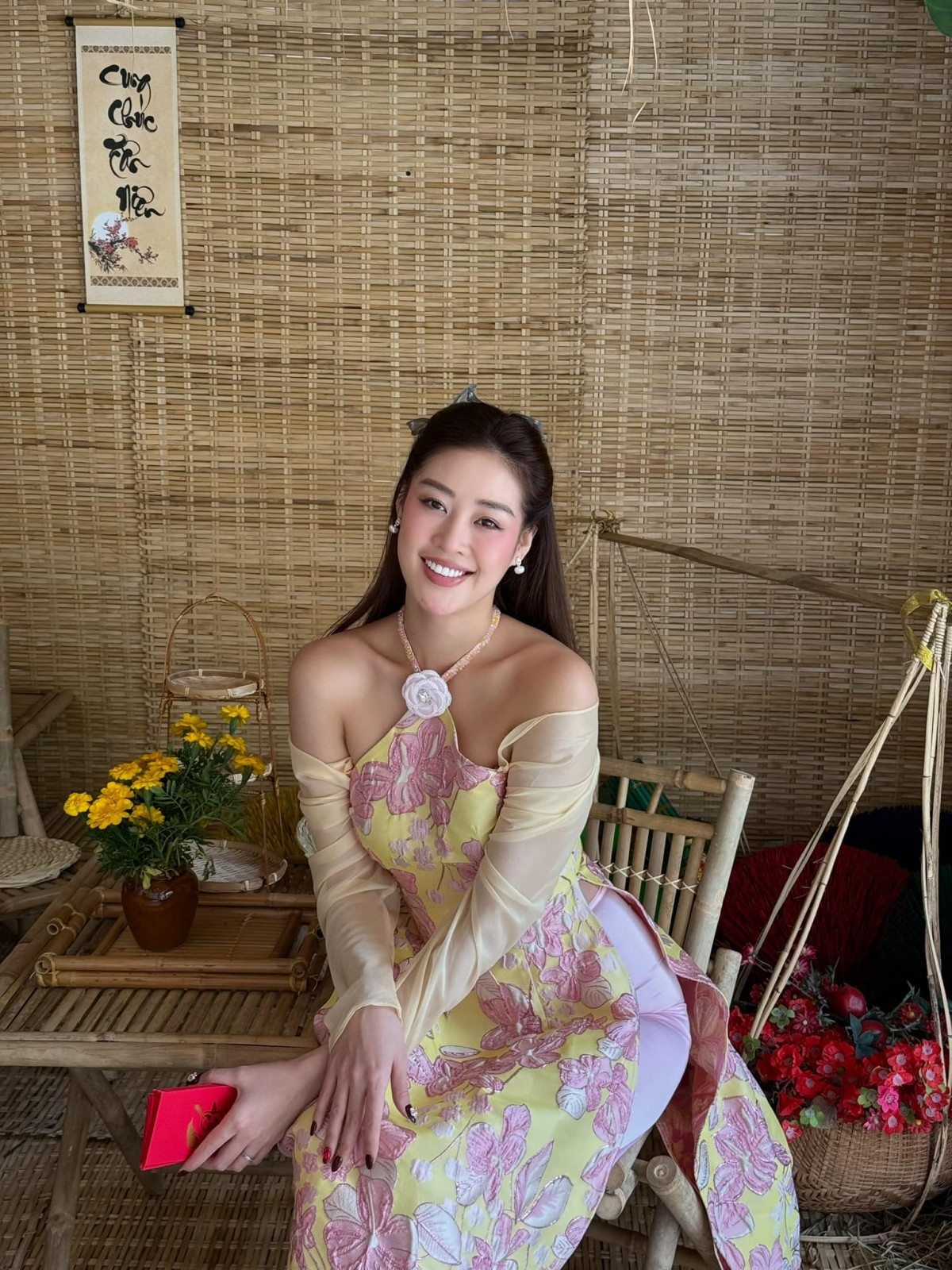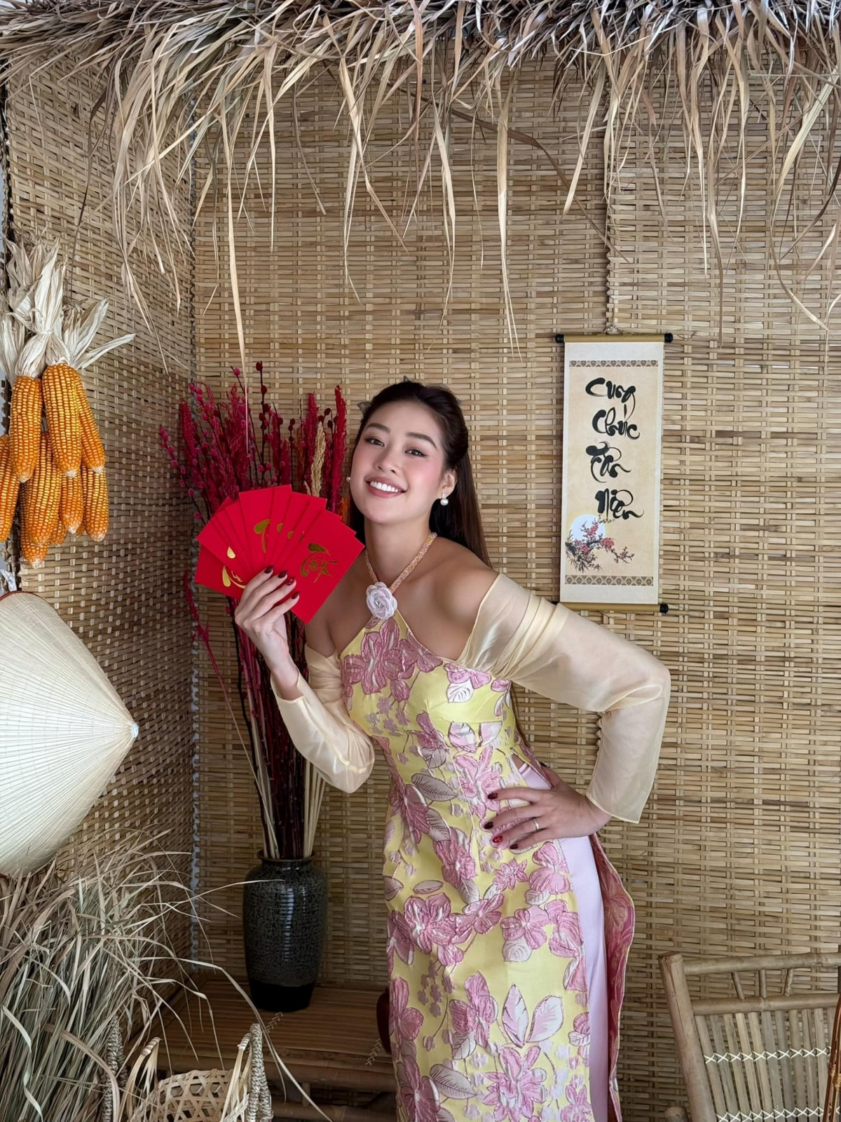 Hoa hậu Khánh Vân chọn áo dài cách điệu cũng tông hồng vàng, cầm bao lì xì chúc mừng năm mới Ất Tỵ.