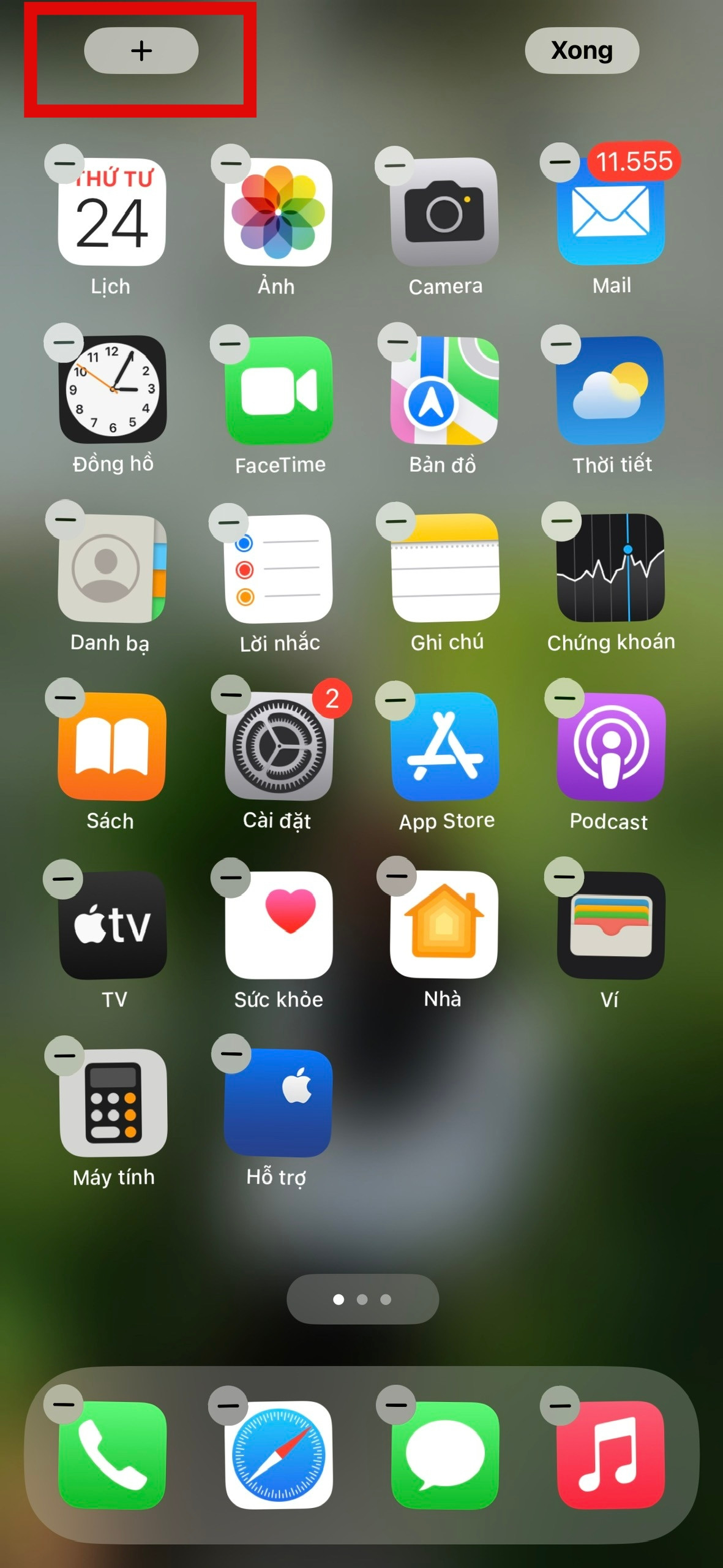 Bước 2: Thoát ra màn hình chính trên iPhone, nhấn và giữ vào màn hình rồi chọn biểu tượng dấu cộng ở góc trên bên trái màn hình.