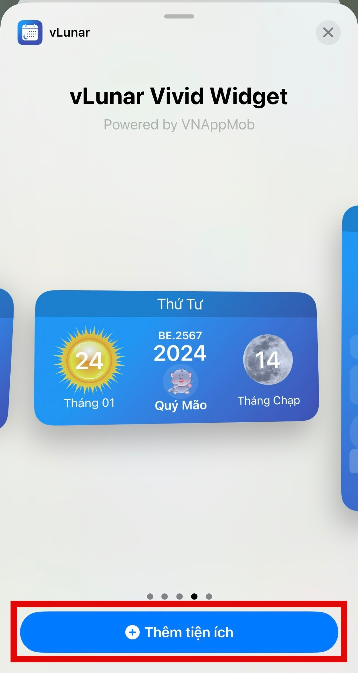 Bước 3: Chọn biểu tượng vLunar Pip Widget. Lướt qua trái để lựa chọn kích thước widget tùy theo ý thích.