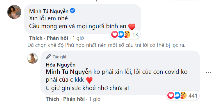 Bên dưới bài viết, Minh Tú đã để lại bình luận xin lỗi và mong mọi người đều bình an. Ngay sau đó, Hòa Minzy đã an ủi người chị của mình: “Không phải xin lỗi, lỗi của con COVID không phải của chị. Chị giữ gìn sức khoẻ nhớ chưa ạ!”. Khán giả đều gửi lời chúc may mắn và mong rằng Hòa Minzy sẽ cố gắng giữ gìn sức khỏe để sớm trở về nhà an toàn.