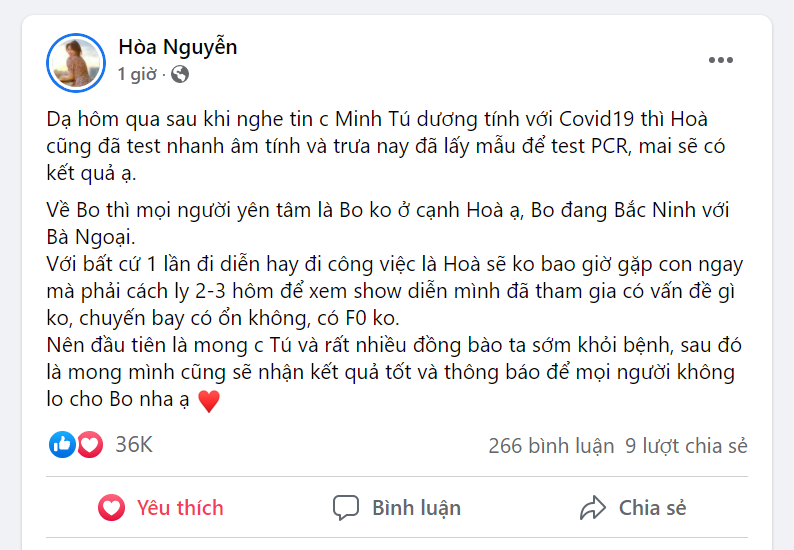 Bên cạnh đó, Hòa Minzy cũng động viên khán giả không cần quá lo lắng cho bé Bo bởi cô không ở cạnh con trai thời điểm này. Cô viết: “Về Bo thì mọi người yên tâm là Bo không ở cạnh Hòa ạ, Bo đang ở Bắc Ninh với bà ngoại. Với bất cứ 1 lần đi diễn hay đi công việc là Hòa sẽ không bao giờ gặp con ngay mà phải cách ly 2 - 3 hôm để xem show diễn mình đã tham gia có vấn đề gì không, chuyến bay có ổn không, có F0 không”.
