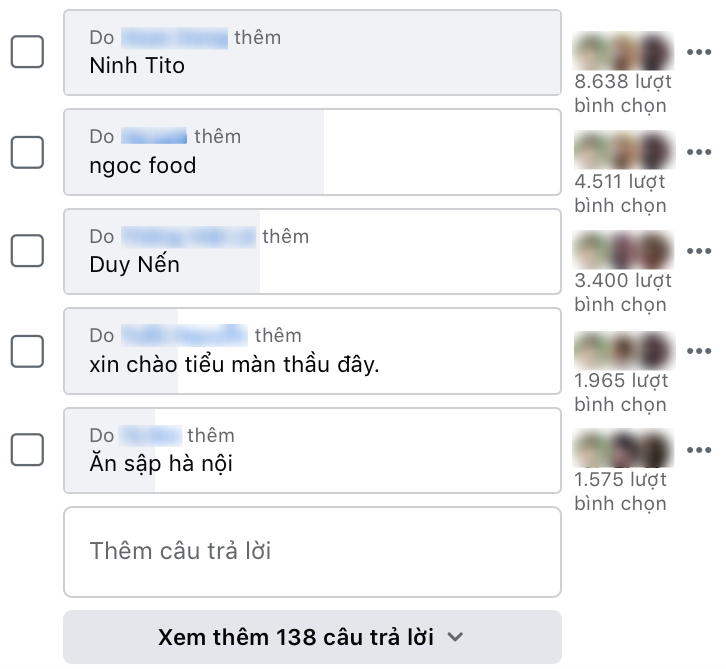 Trong đó, 5 cái tên đứng "đầu bảng" gồm có: Ninh Tito (8,8K lượt bình chọn), Ngoc Food (4,6K lượt bình chọn), Duy Nến (3,5K lượt bình chọn), Tiểu Màn Thầu (2K lượt bình chọn), Ăn sập Hà Nội (1,6K lượt bình chọn). Lý do được dân mạng đưa ra khi "vote" những cái tên này là vì "review không có tâm, quảng cáo một cách bất chấp".