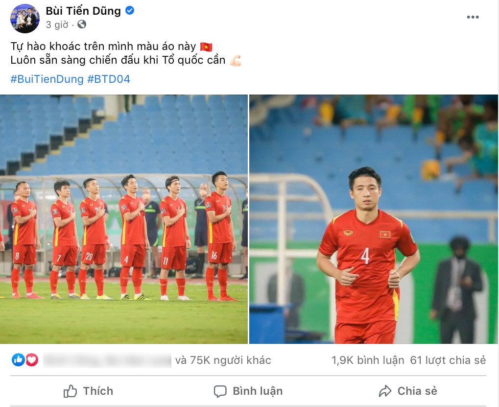Ngay sau khi trận đấu kết thúc, các cầu thủ đội tuyển Việt Nam đã có bài đăng trên Facebook cá nhân chia sẻ những suy nghĩ của mình sau một trận đấu đầy cảm xúc, thu hút sự chú ý của cộng đồng mạng cũng như người hâm mộ. Mới đây, cầu thủ Bùi Tiến Dũng đã đăng 2 bức hình trong trận đấu kèm theo dòng trạng thái: "Tự hào khoác trên mình màu áo này. Luôn sẵn sàng chiến đấu khi Tổ quốc cần".