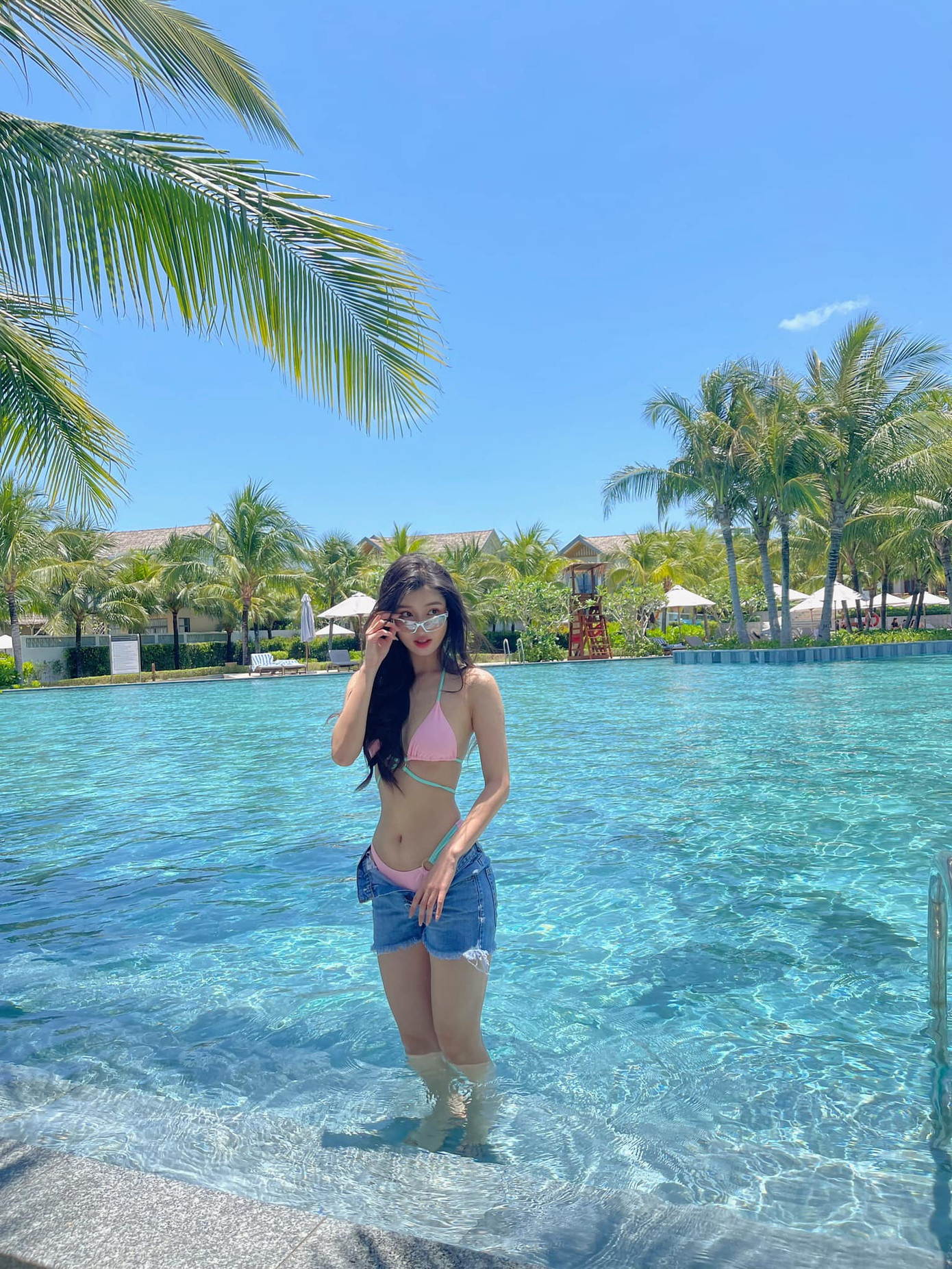 Phương Nhi còn táo bạo hơn nữa khi kết hợp soóc siêu ngắn với bikini hồng ngọt ngào. Dù đứng dưới bể bơi để tạo dáng khiến cho đôi chân bị ngắn hơn bình thường do mặt nước che lấp, “thần tiên tỷ tỷ thế hệ mới” vẫn khoe được hình thể cực ổn của mình.