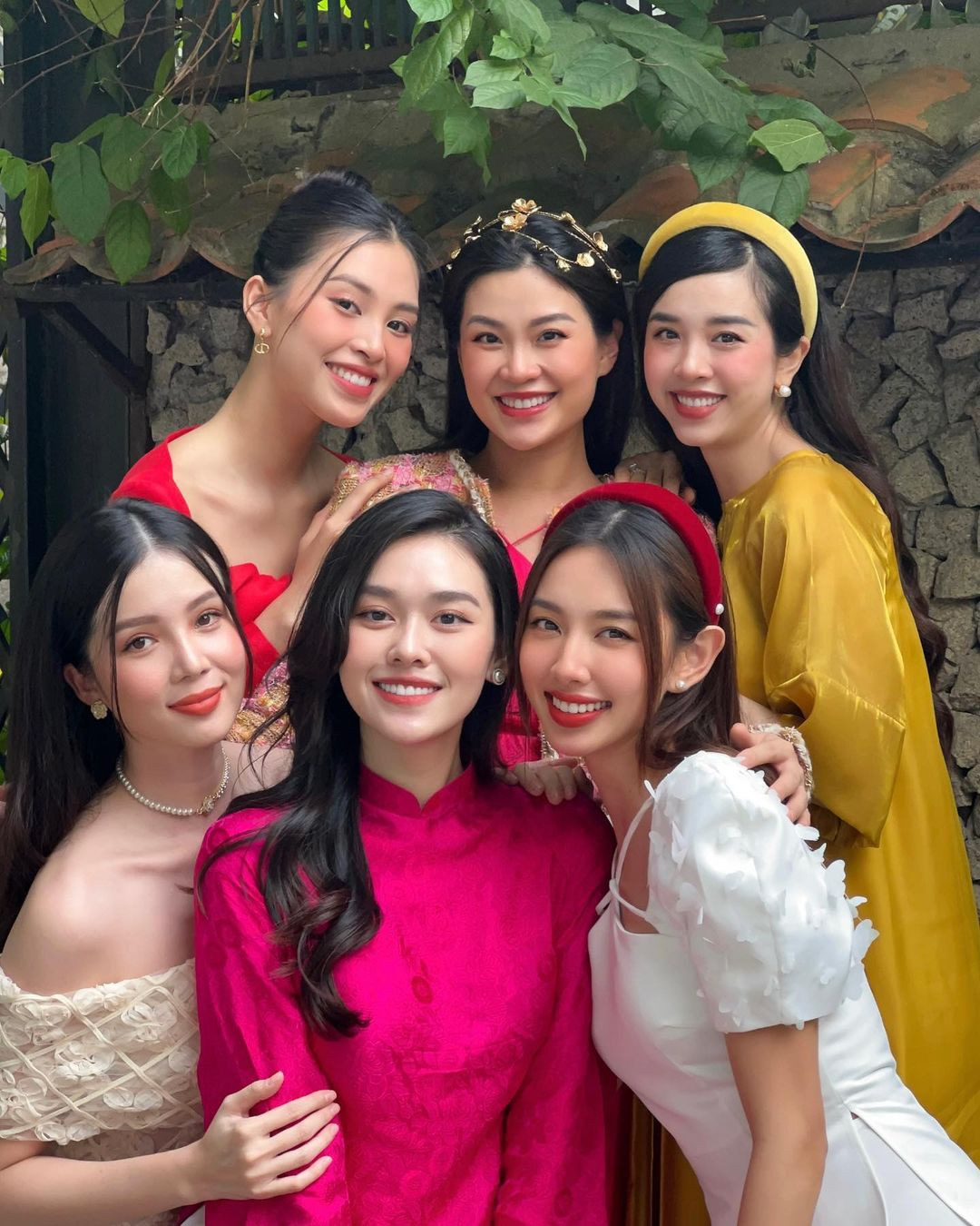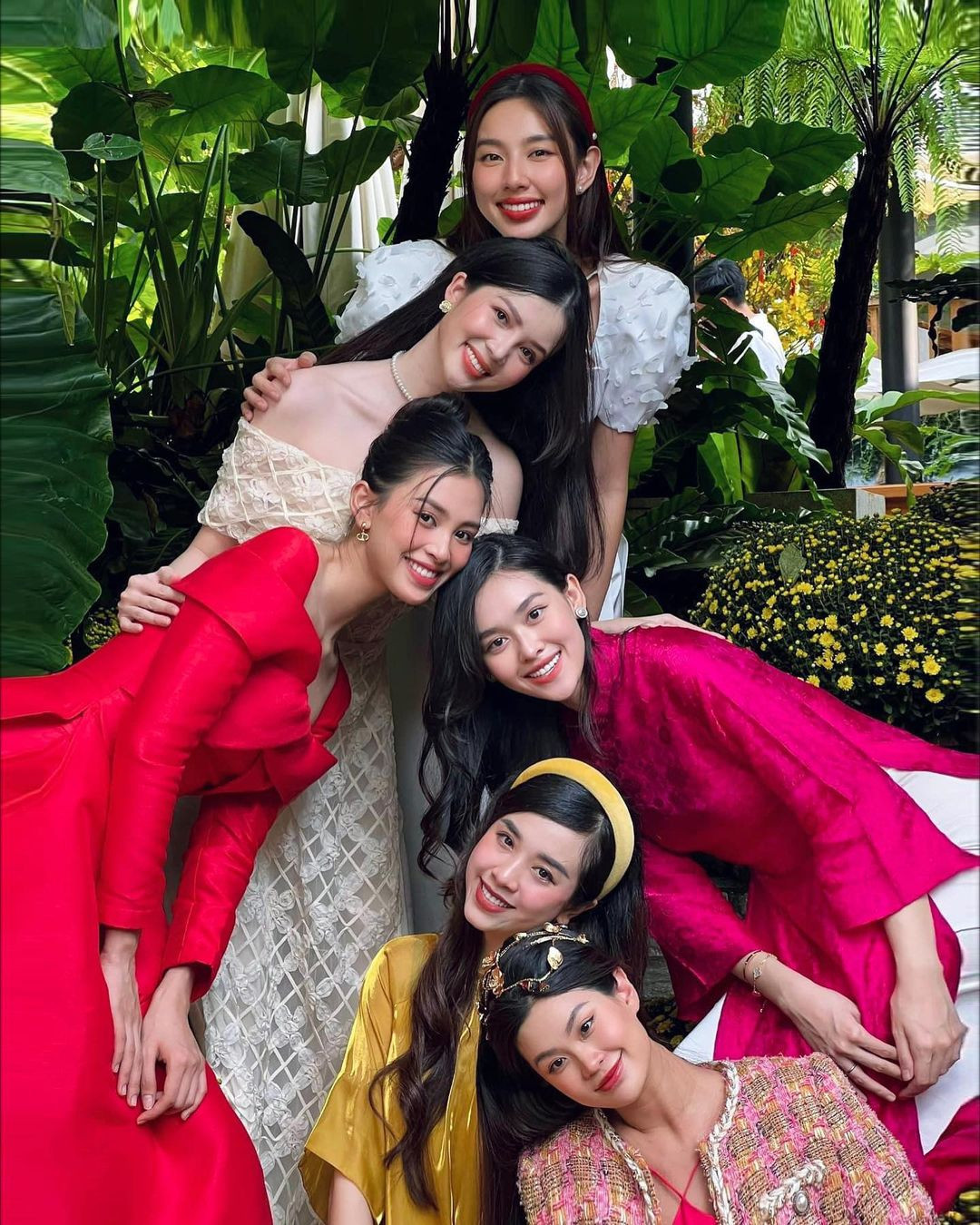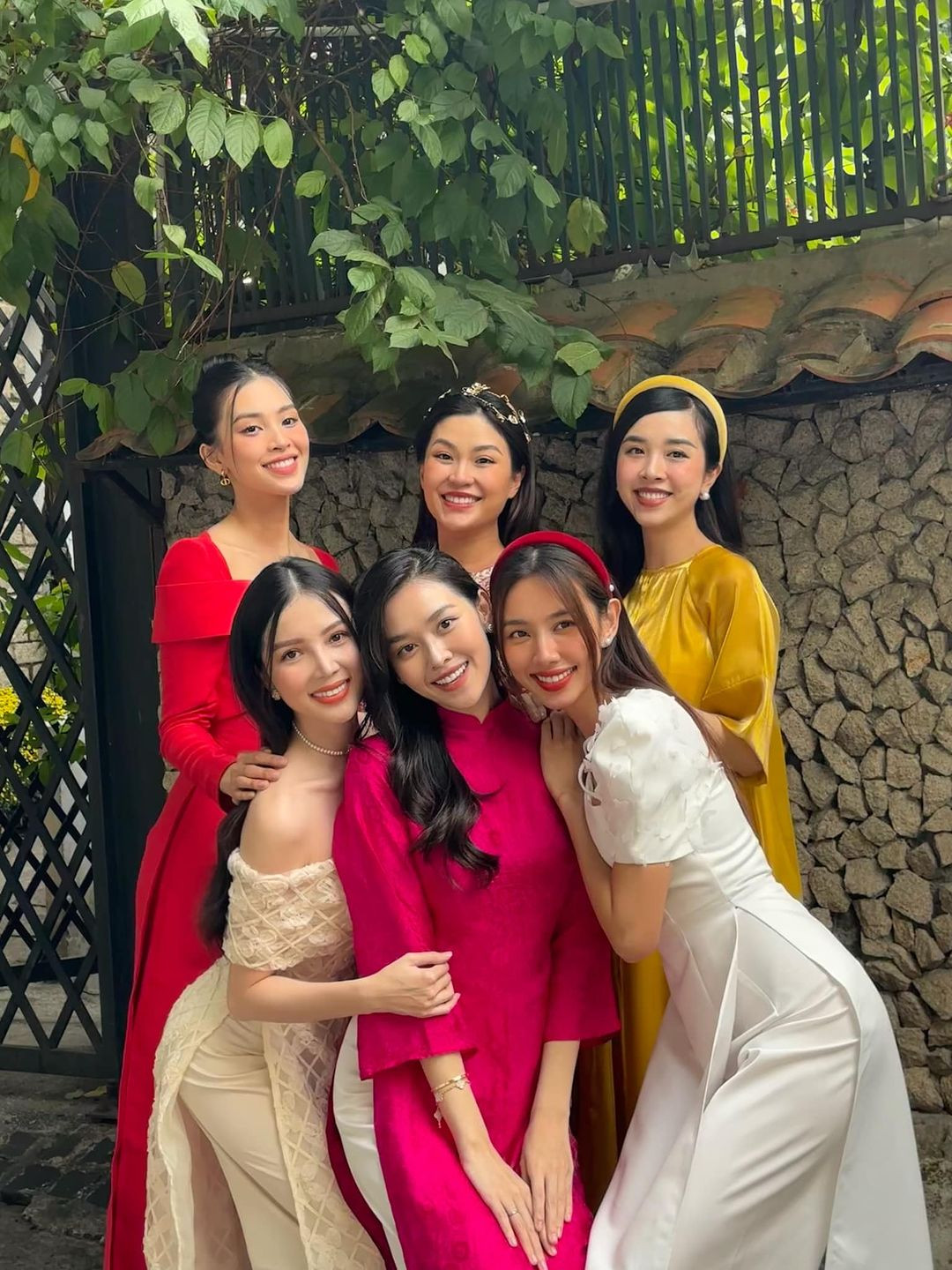 Bức ảnh hội tụ các nàng hậu: Hoa hậu Thùy Tiên, Hoa hậu Tiểu Vy, Á hậu Tường San, Á hậu Diễm Trang, Á hậu Thúy An và Hoa khôi Thúy Vi. Các nàng hậu diện áo dài nhẹ nhàng, khoe thần thái “đỉnh cao” trước ống kính. Những chiếc áo dài với các gam màu đỏ, hồng, vàng... rực rỡ thắp lên không khí Tết rộn ràng. Có thể thấy, cả 6 mỹ nhân đều sở hữu gương mặt thanh thoát, ưa nhìn cùng ngũ quan hài hòa khiến người xem khó có thể rời mắt.