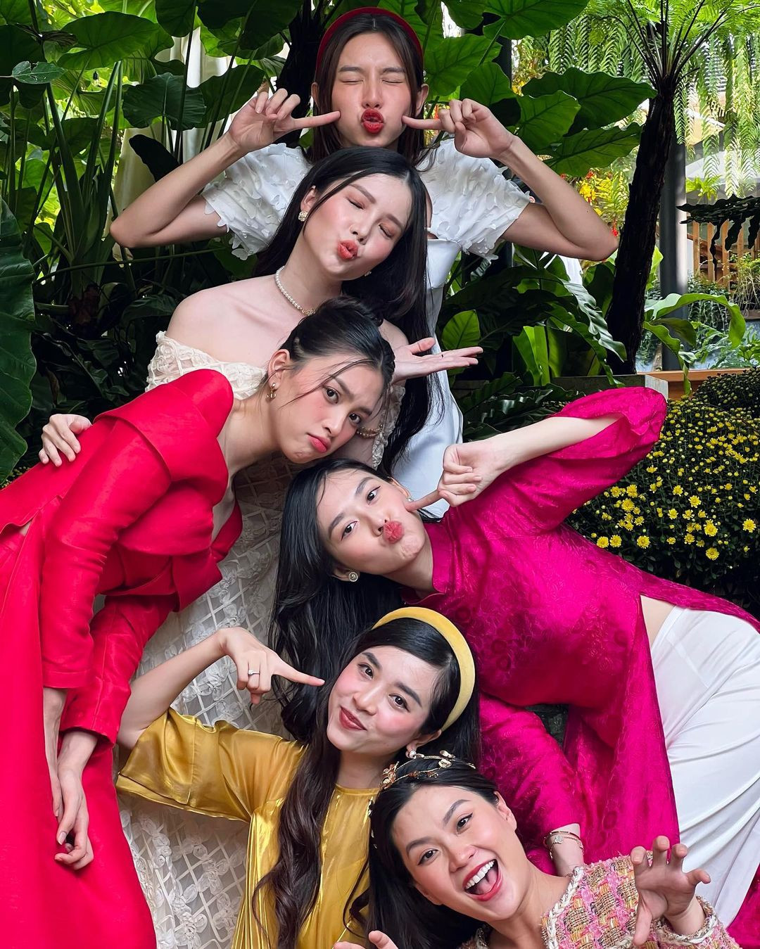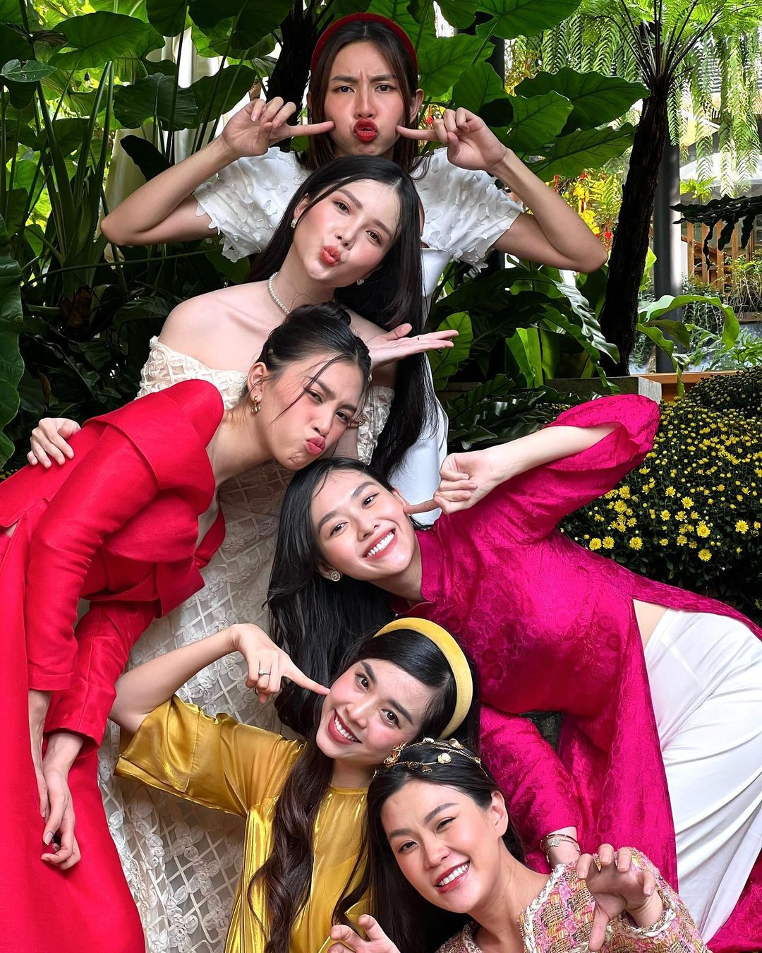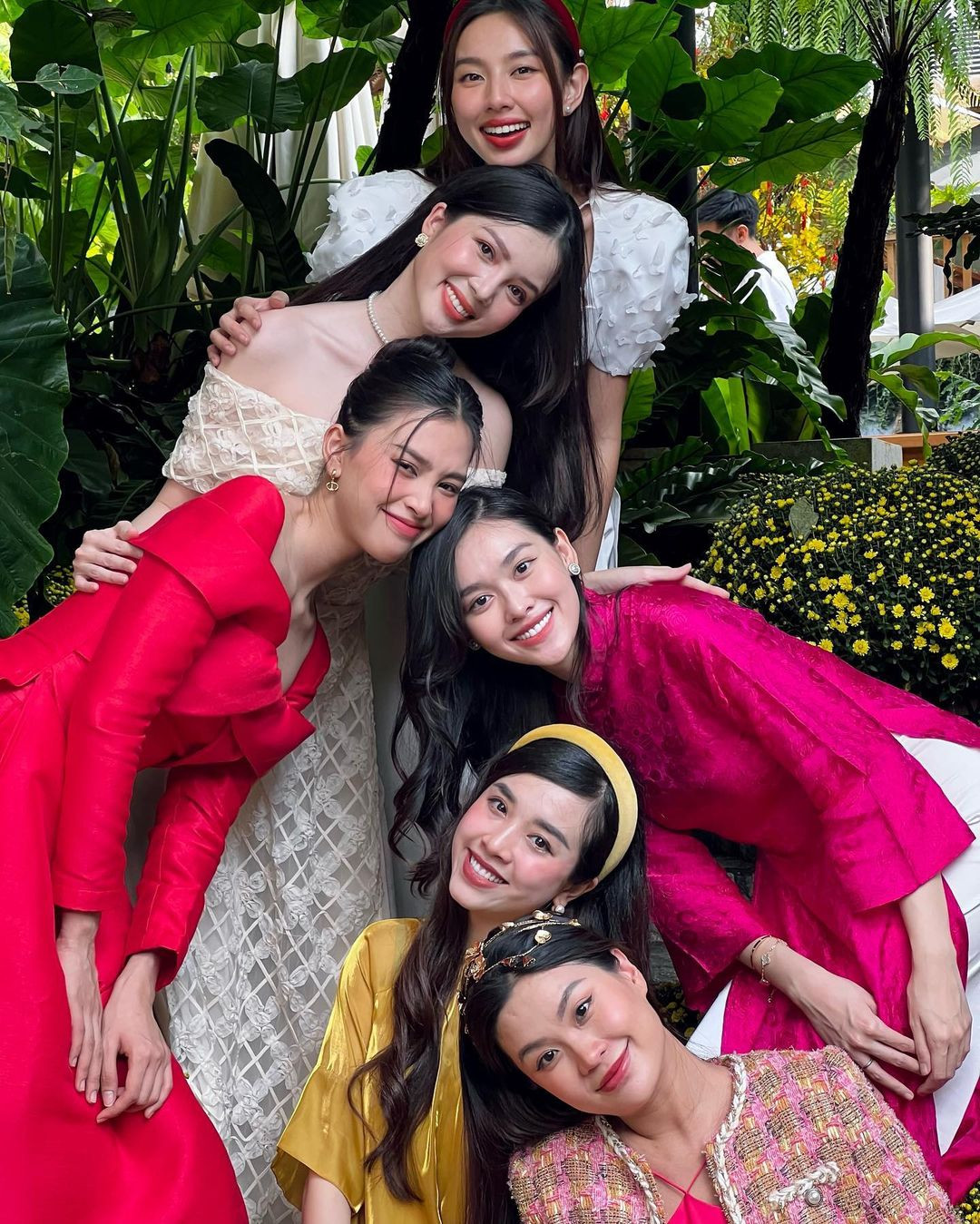 Bức ảnh hội tụ các nàng hậu: Hoa hậu Thùy Tiên, Hoa hậu Tiểu Vy, Á hậu Tường San, Á hậu Diễm Trang, Á hậu Thúy An và Hoa khôi Thúy Vi. Các nàng hậu diện áo dài nhẹ nhàng, khoe thần thái “đỉnh cao” trước ống kính. Những chiếc áo dài với các gam màu đỏ, hồng, vàng... rực rỡ thắp lên không khí Tết rộn ràng. Có thể thấy, cả 6 mỹ nhân đều sở hữu gương mặt thanh thoát, ưa nhìn cùng ngũ quan hài hòa khiến người xem khó có thể rời mắt.