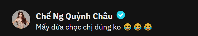 Ngay sau khi thấy câu nói của mình được nhiều mỹ nhân cover trên mạng xã hội, chính chủ cũng đã lên tiếng vì hoang mang không hiểu chuyện gì xảy ra. Theo đó, Quỳnh Châu đã phải nhanh chóng để lại bình luận: "Mấy đứa chọc chị đúng không?" để mong nhận được phản hồi từ các em thân thiết của mình.