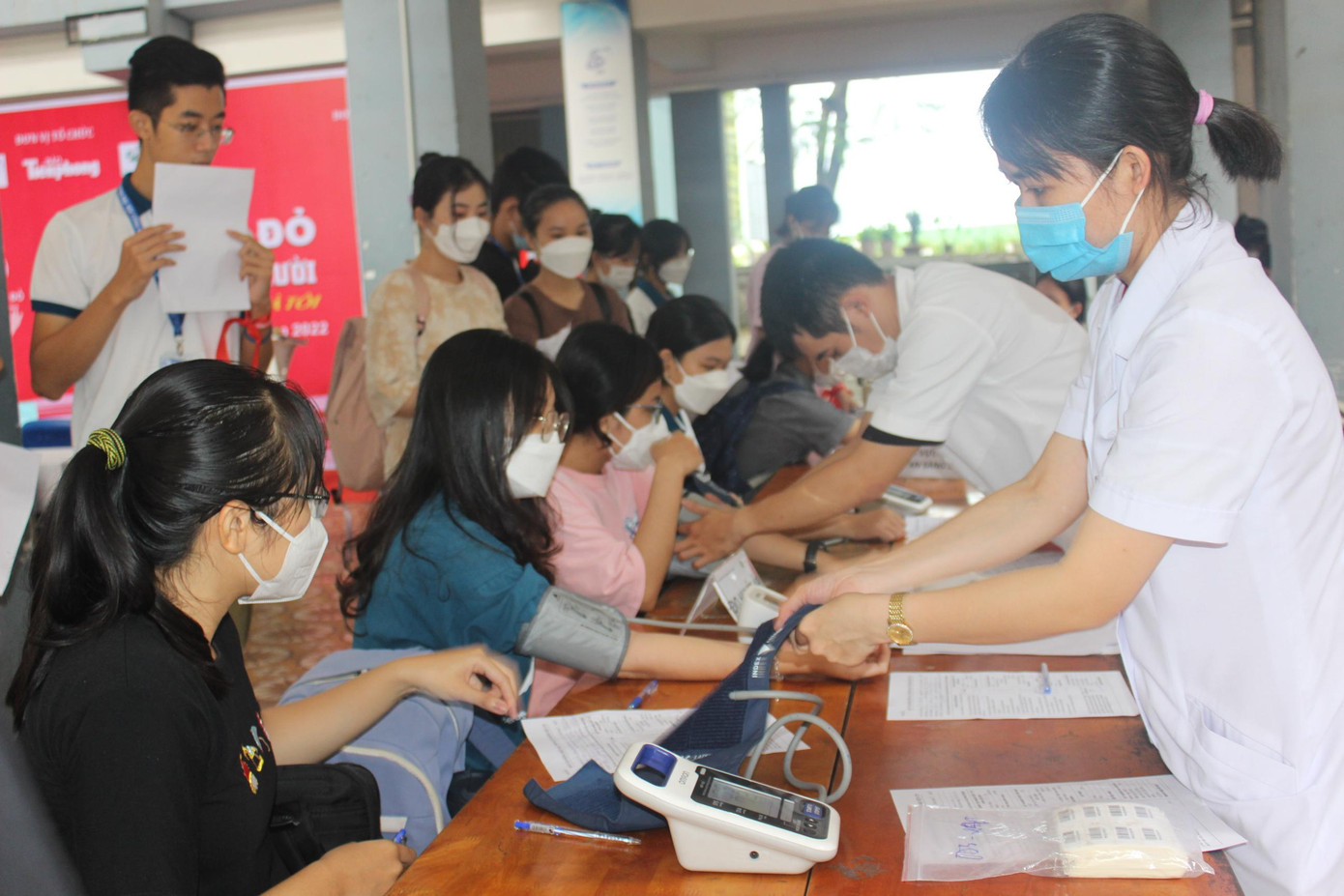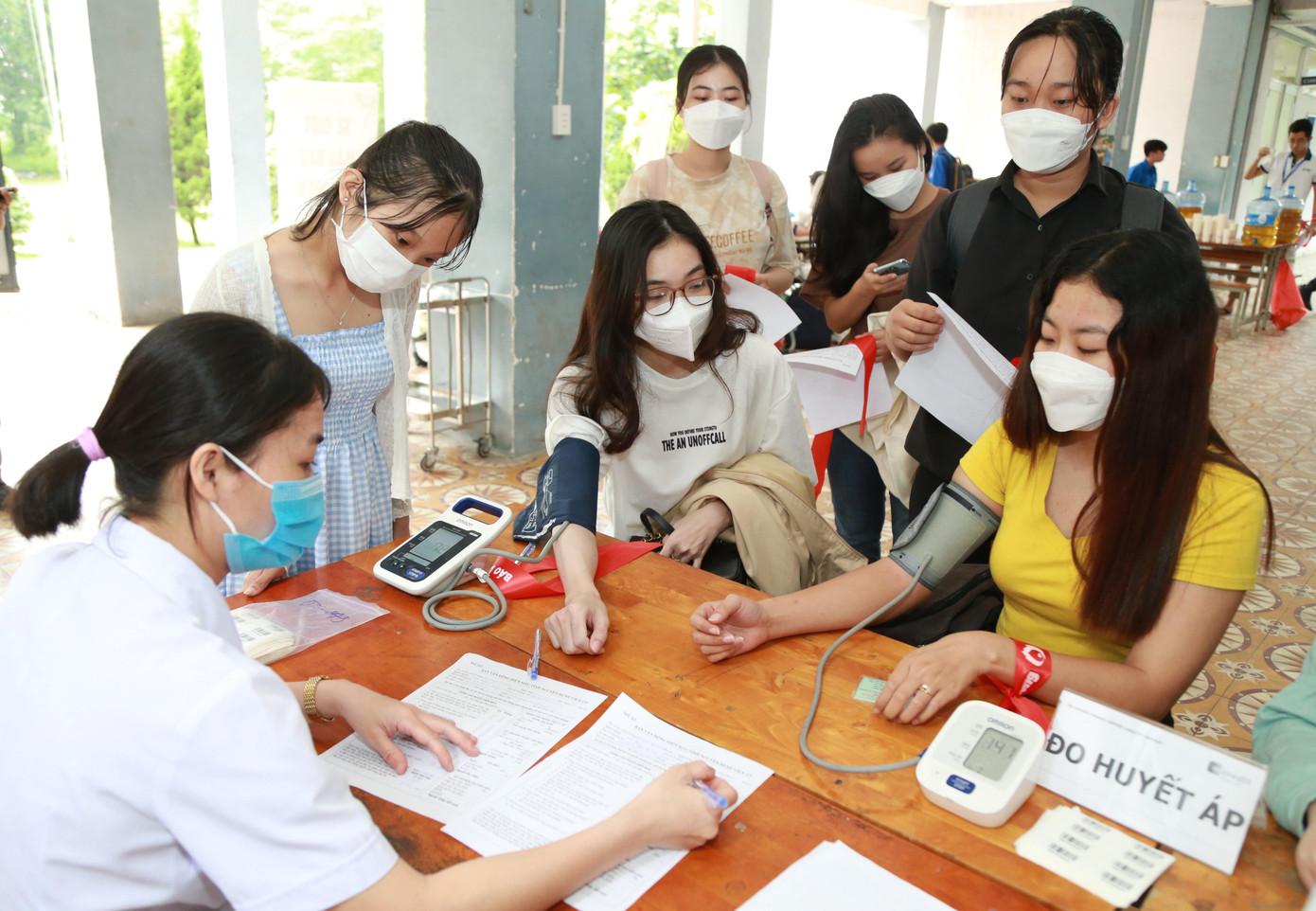 | Tranh thủ trước giờ học tập, rèn luyện, nhiều bạn sinh viên nhà trường đã có mặt tại khu vực tổ chức chương trình để đăng ký, kiểm tra sức khỏe và cho máu. |