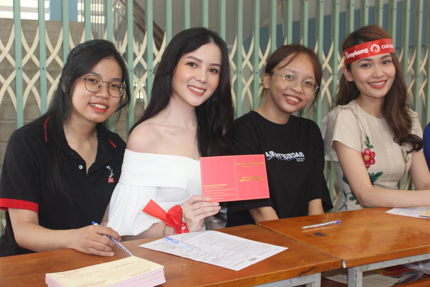 | Hoa khôi Huỳnh Thúy Vi thăm hỏi sinh viên hiến máu. |