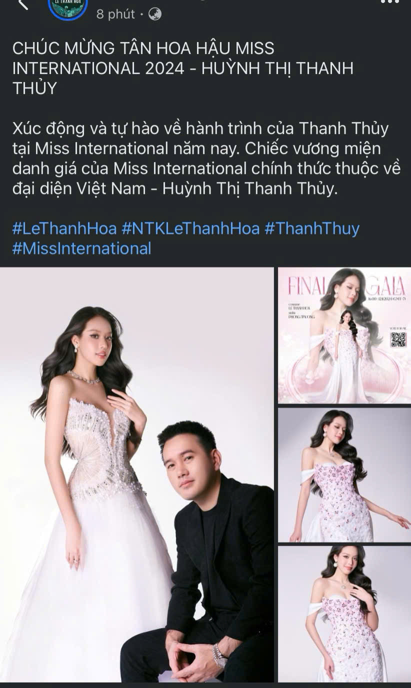 Nhà thiết kế Lê Thanh Hòa - người thiết kế trang phục dạ hội đêm Chung kết cho Thanh Thủy cũng nhanh chóng chia sẻ cảm xúc. Anh cảm thấy xúc động và tự hào về hành trình của Thanh Thủy tại Miss International năm nay.