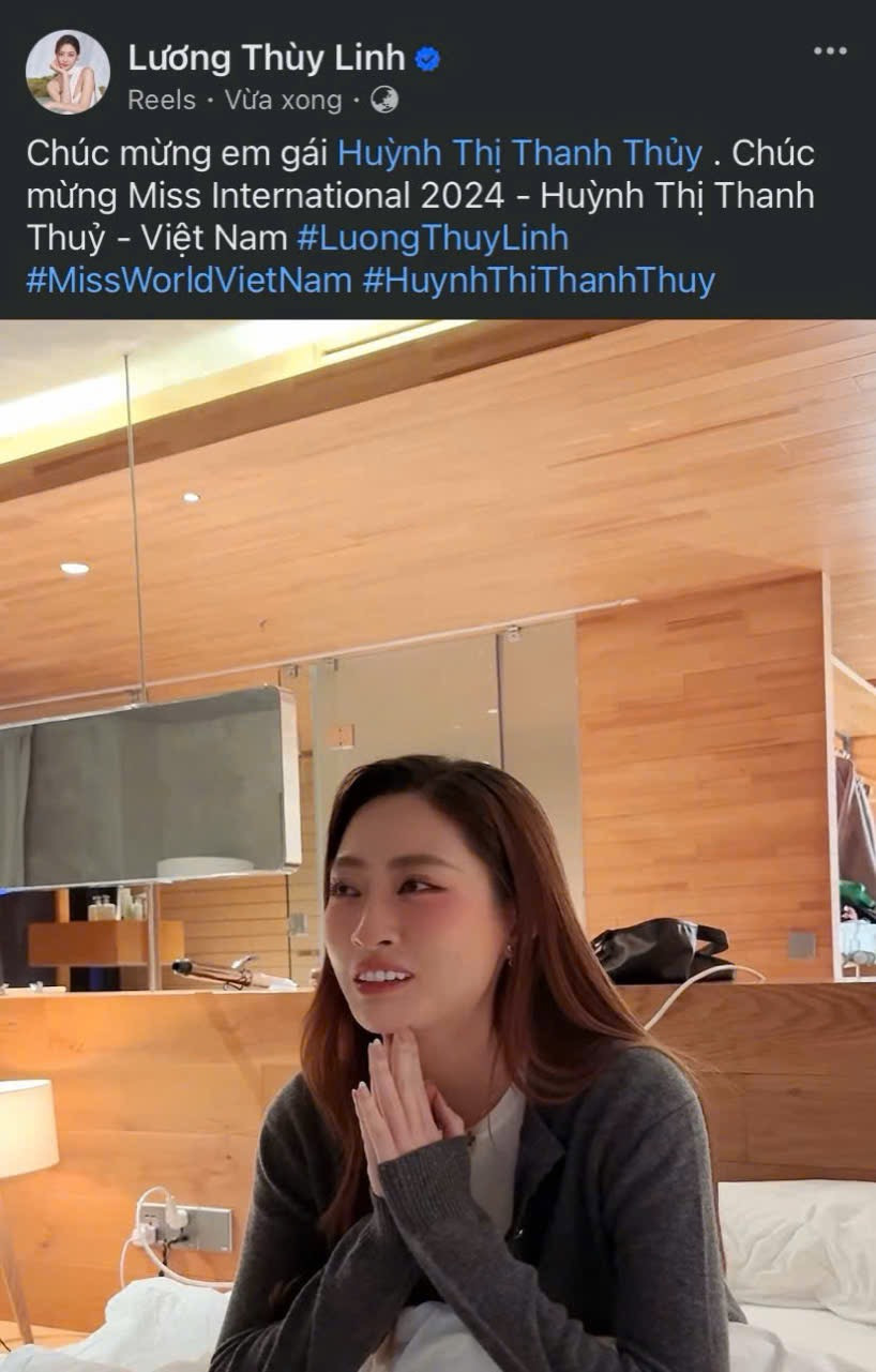 Hàng loạt người đẹp Việt đã nhanh chóng gửi thông điệp trên mạng xã hội để chúc mừng Hoa hậu Huỳnh Thị Thanh Thủy. Trên trang facebook cá nhân, Hoa hậu Lương Thùy Linh đã chia sẻ cảm xúc vỡ òa của mình khi Thanh Thủy đăng quang Miss International 2024.