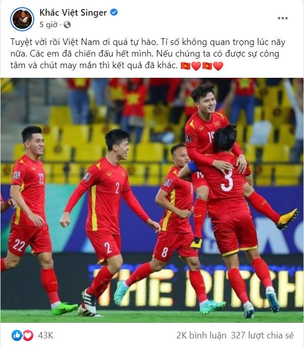 Trong khi đó, ca sĩ Khắc Việt đăng tải dòng trạng thái lên mạng xã hội: “Tuyệt vời rồi Việt Nam ơi quá tự hào. Tỉ số không quan trọng lúc nãy nữa. Các em đã chiến đấu hết mình. Nếu chúng ta có được sự công tâm và chút may mắn thì kết quả đã khác”.