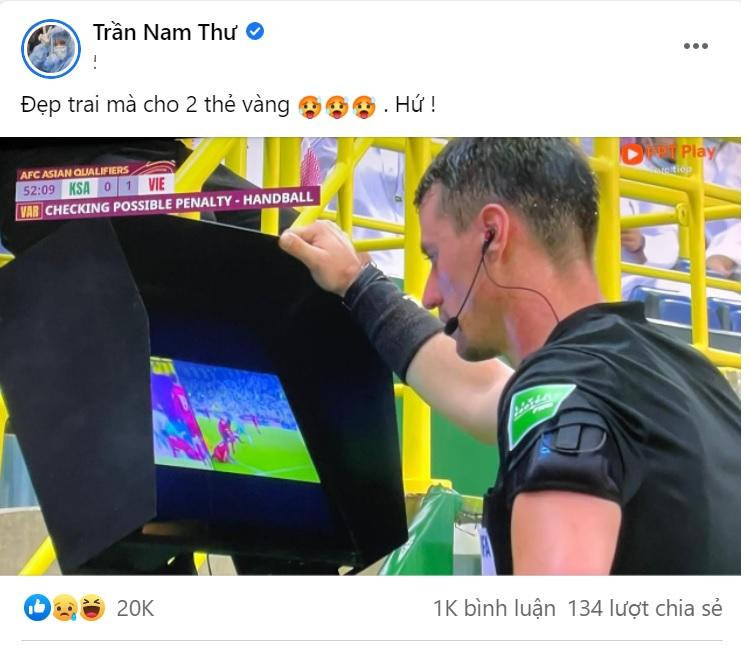 Diễn viên Nam Thư hài hước nói: “Đẹp trai mà cho 2 thẻ vàng”. Tuy nhiên, cô không nhất trí với việc nhiều người “truy lùng” tài khoản Facebook cá nhân của trọng tài để gây rối: “Không đồng quan điểm với việc kêu gọi report Facebook trọng tài nha cả nhà ơi. Fan văn minh thì hành động chân chính nha. Thật sự trọng tài bắt đúng mà, chỉ là mình thấy hơi khắt khe thôi nên xót đội mình”, Nam Thư cho biết. Sau cùng, cô gửi lời cảm ơn đến các cầu thủ tuyển nhà đã nỗ lực hết mình và hẹn gặp lại đối thủ trên sân Mỹ Đình.