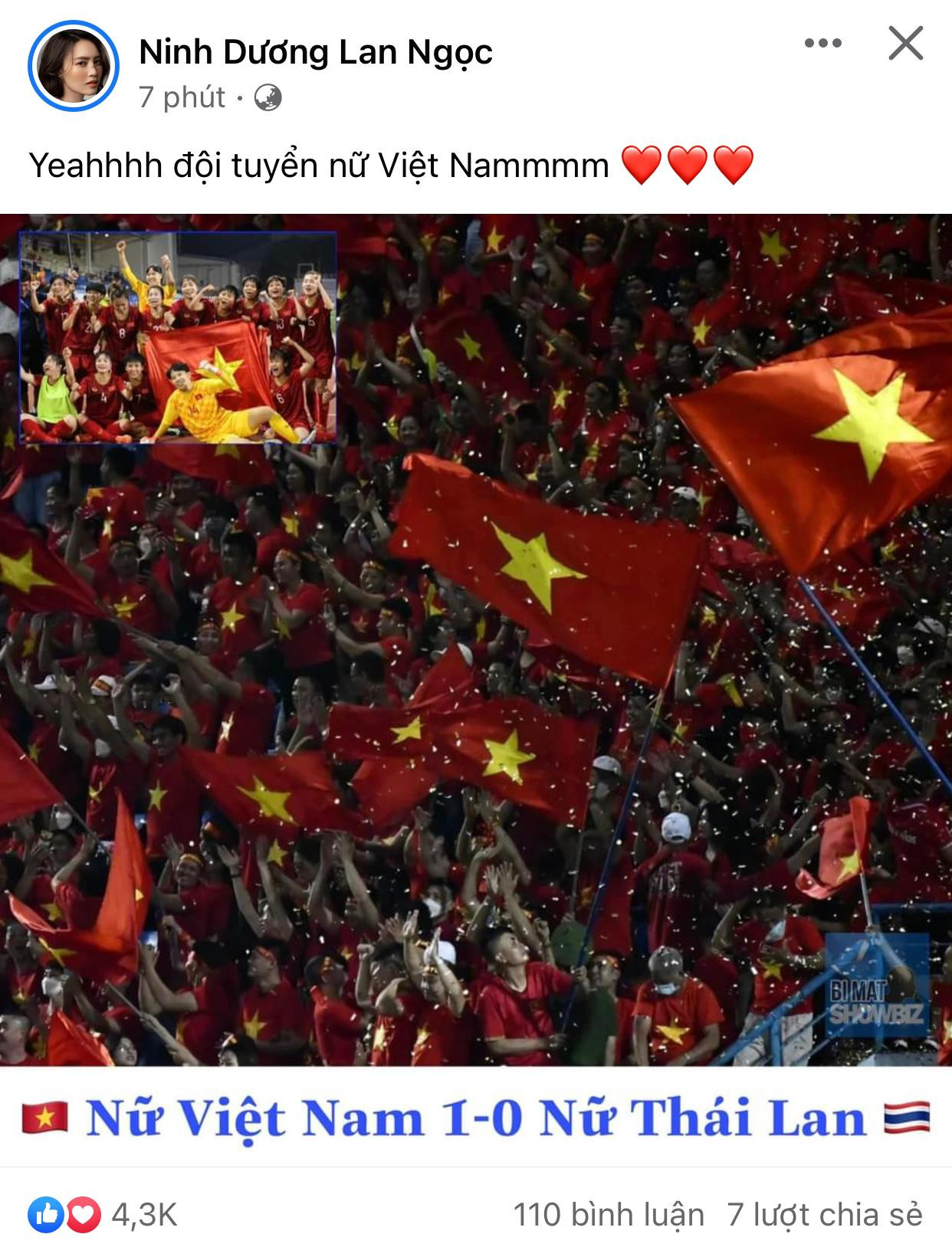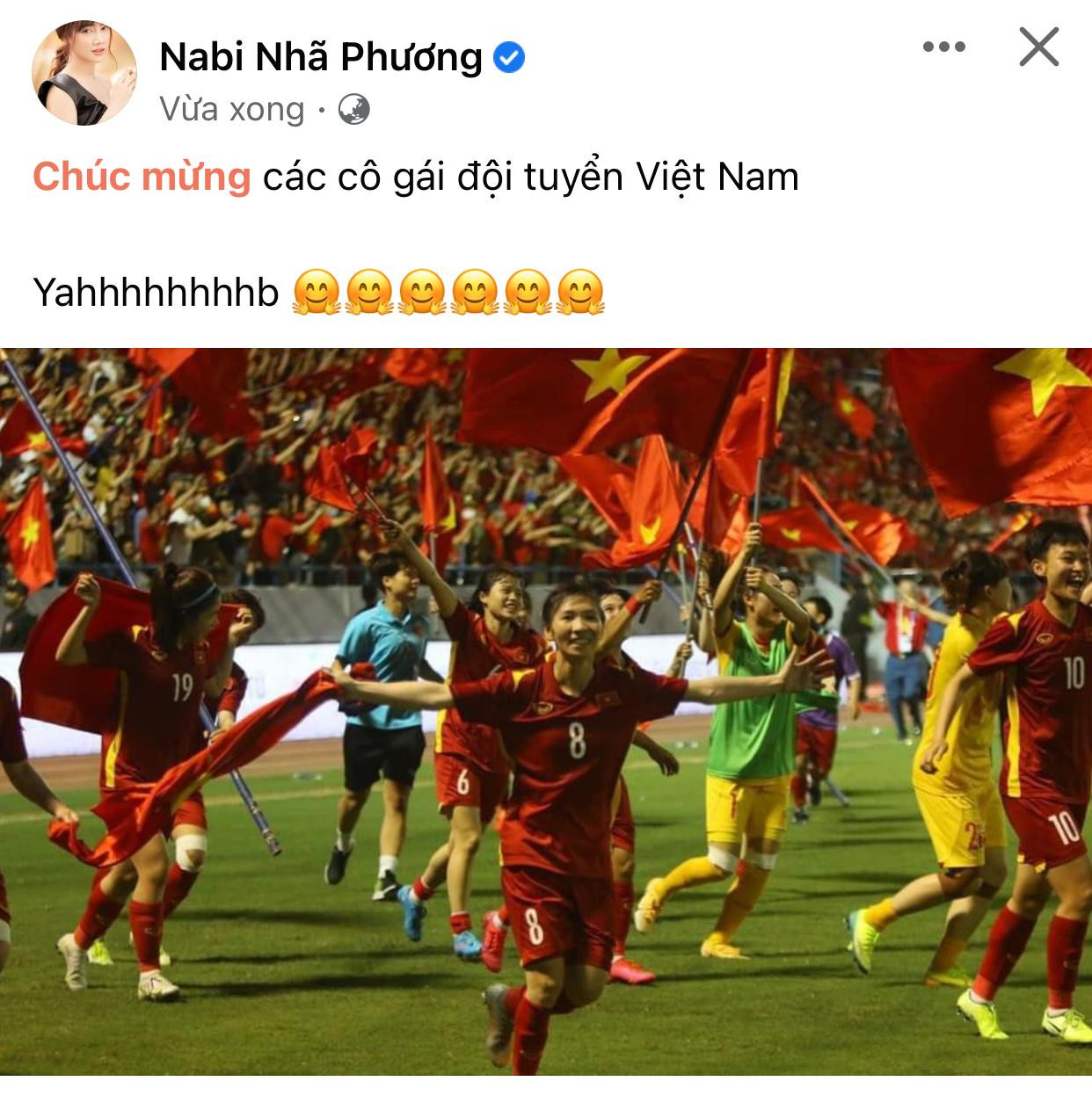 Chiến thắng ngọt ngào của tuyển nữ Việt Nam khiến mạng xã hội “bùng nổ”. Không chỉ cộng đồng mạng mà dàn sao Việt cũng hào hứng sẻ chia niềm vui chiến thắng.