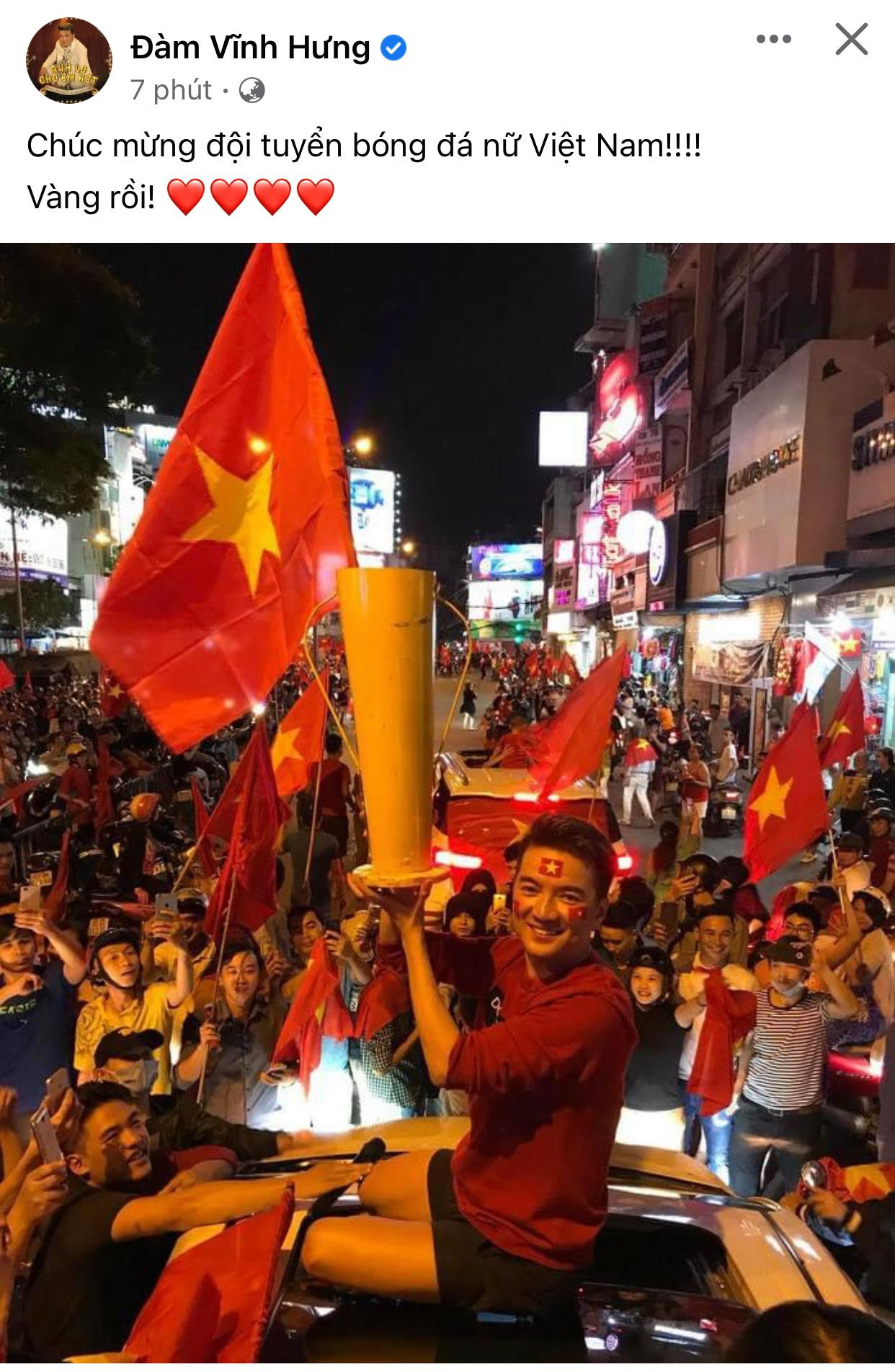 Ca sĩ Đàm Vĩnh Hưng chia sẻ tấm hình "đi bão" để chúc mừng chiến thắng ngọt ngào của thầy trò HLV Mai Đức Chung. Đây là lần thứ 7, tuyển nữ Việt Nam lên ngôi vô địch SEA Games.