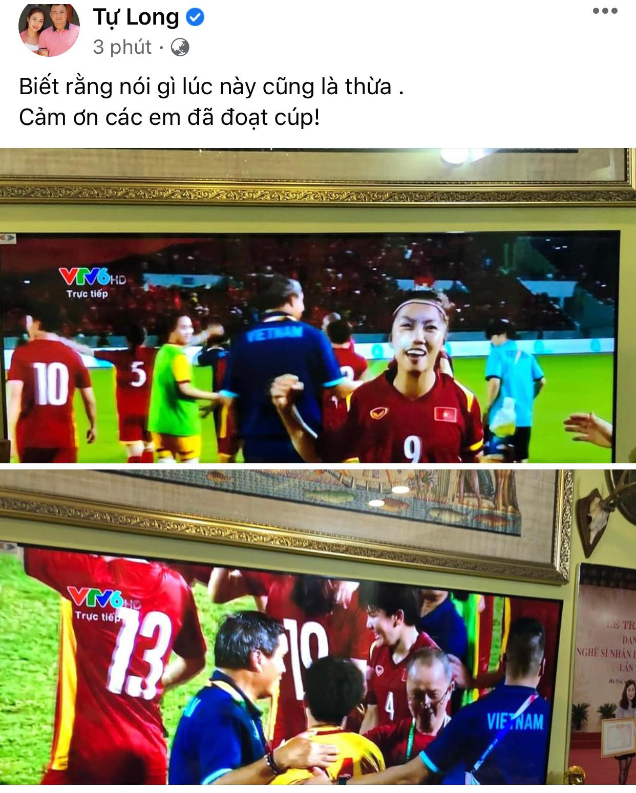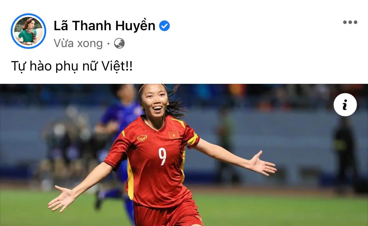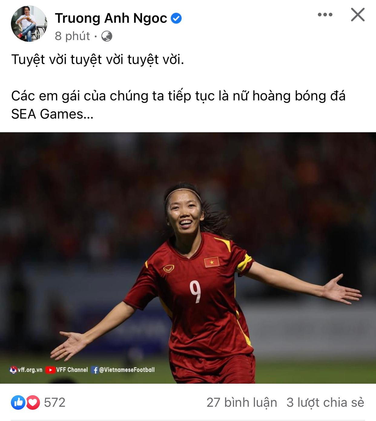 Những tấm hình đầy cảm xúc khi Huỳnh Như ghi bàn thắng và khi tiếng còi mãn cuộc vang lên được các ngôi sao chia sẻ nhiệt tình trên mạng xã hội. Lã Thanh Huyền, Khắc Việt tự hào về phụ nữ Việt Nam. BLV Trương Anh Ngọc chia vui: "Các em gái của chúng ta tiếp tục là nữ hoàng bóng đá SEA Games"... Trong khi đó, diễn viên Tuấn Trần hô hào mọi người cùng "đi bão".