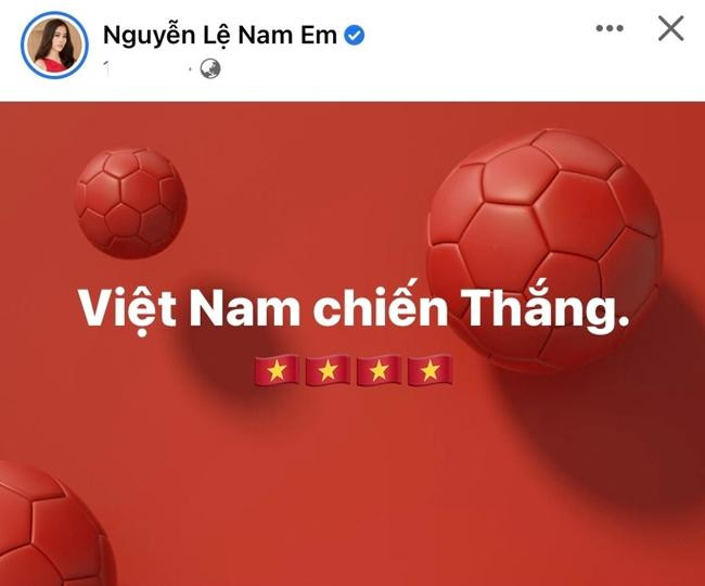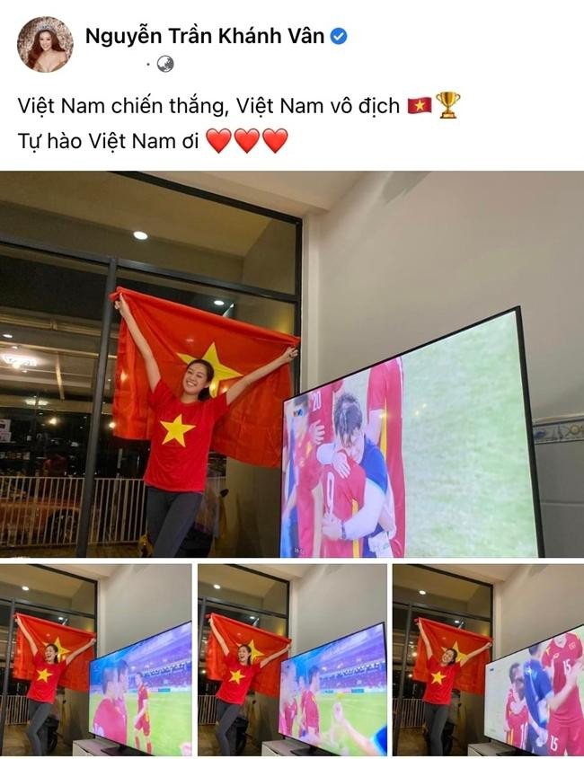 Hoa hậu Đỗ Thị Hà khoe ảnh mặc áo cờ đỏ sao vàng, cười rạng rỡ trên sân cùng lời chúc mừng: "Aaaa chúc mừng đội tuyển Việt Nam vô địch. Vui quá huhu vỡ oà cảm xúc".