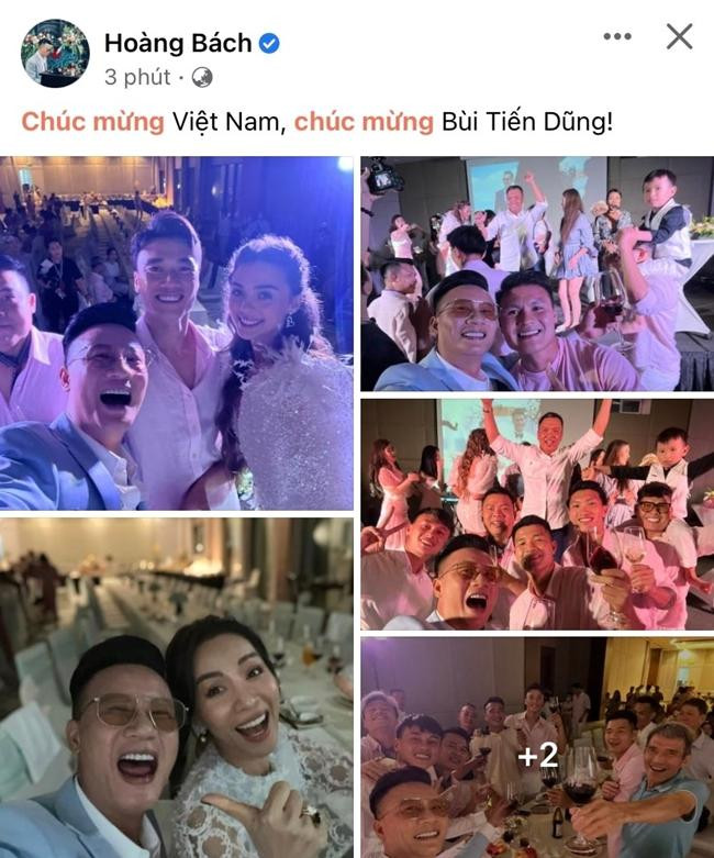 Trong khi đó, ca sĩ Hoàng Bách đang đi đám cưới của Thủ môn Bùi Tiến Dũng nhưng vẫn không quên khoe những bức ảnh cô dâu chú rể cùng dàn khách mời vui "tới bến" để mừng chiến thắng của đội tuyển U23 Việt Nam.