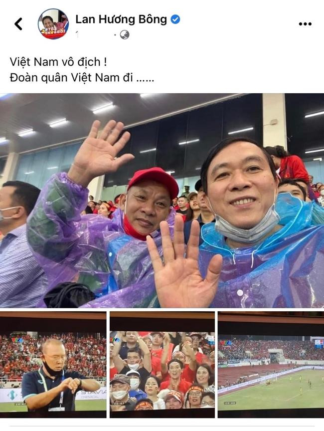 "Mẹ chồng đáng ghét của phim Thương Ngày Nắng Về" NSND Lan Hương tiết lộ bản thân đang bận quay phim nhưng vẫn cố dành thời gian để xem trực tiếp. Nữ nghệ sĩ chia sẻ: "Các chiến binh Việt Nam đã chiến thắng ngoạn mục! VIỆT NAM MUÔN NĂM!". Bà Hiền của Thương Ngày Nắng Về còn đặc biệt khoe ảnh ông xã - nghệ sĩ Đỗ Kỷ mặc áo mưa ra sân cổ vũ cho các chiến binh trong trận Chung kết bóng đá nam SEA Games 31.